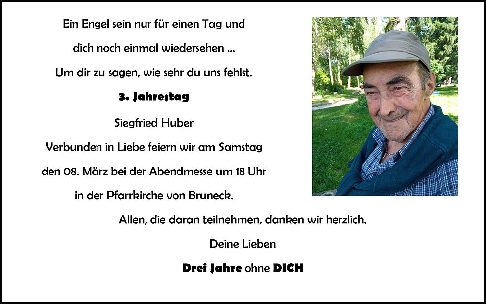 Den Trauergottesdienst feiern wir am Dienstag, dem 15. März, um 14 Uhr in der Pfarrkirche von Bruneck.