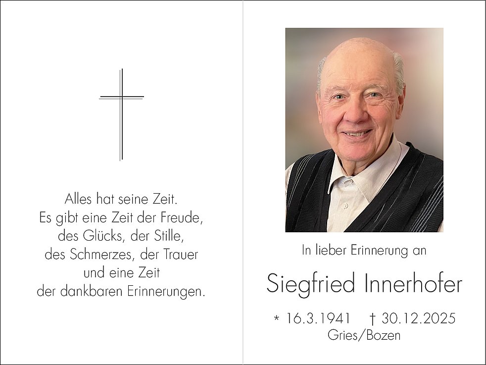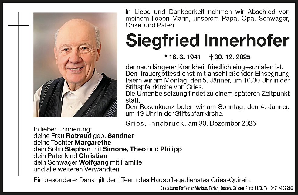 Den Trauergottesdienst mit anschließender Einsegnung feiern wir am Montag, den 5. Jänner, um 10.30 Uhr in der Stiftspfarrkirche von Gries.