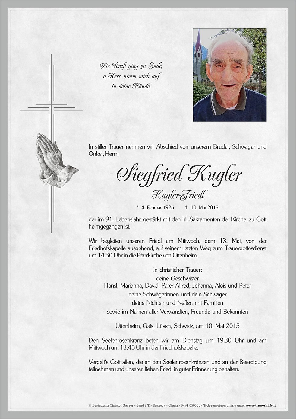 Wir begleiten unseren Friedl am Mittwoch, dem 13. Mai, von der Friedhofskapelle ausgehend, auf seinem letzten Weg zum Trauergottesdienst um 14.30 Uhr in die Pfarrkirche von Uttenheim.