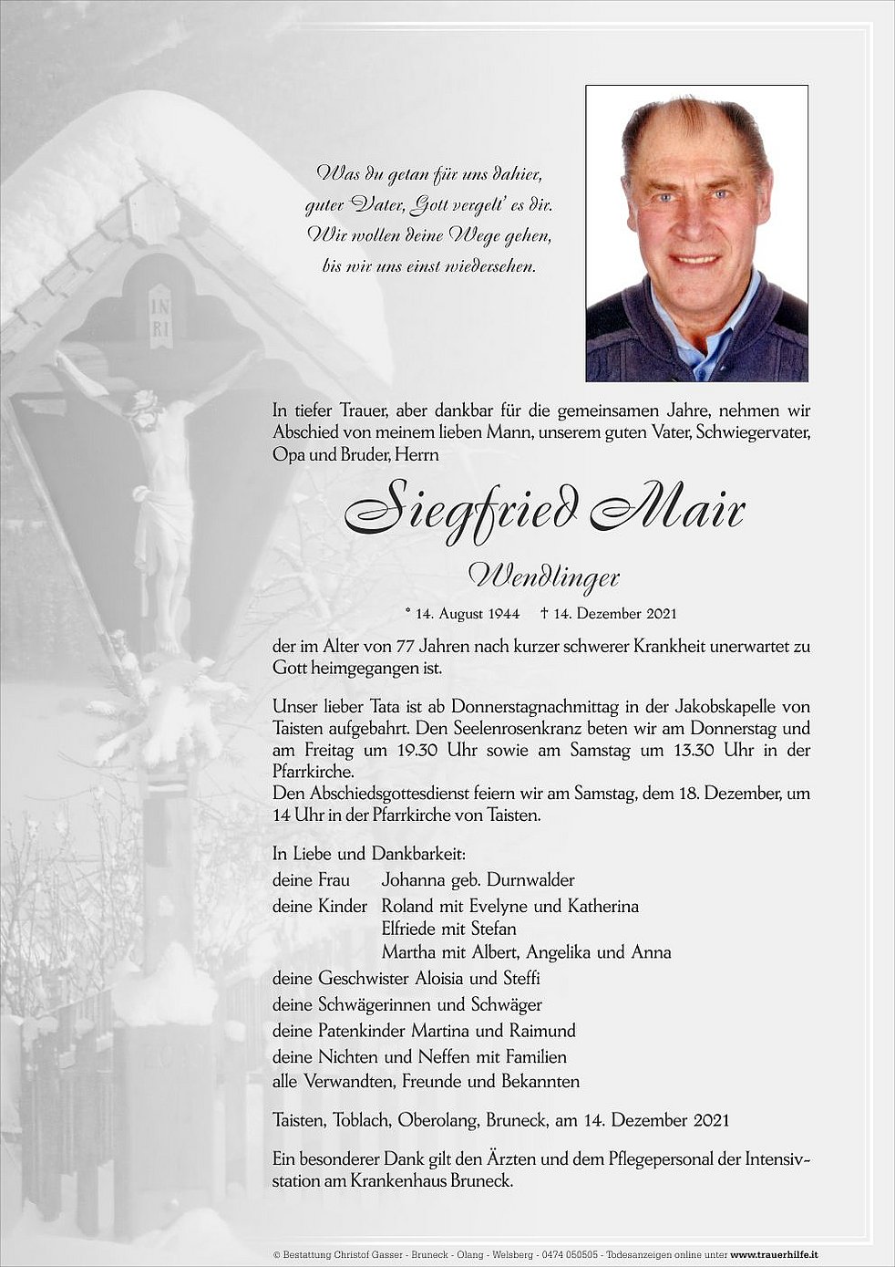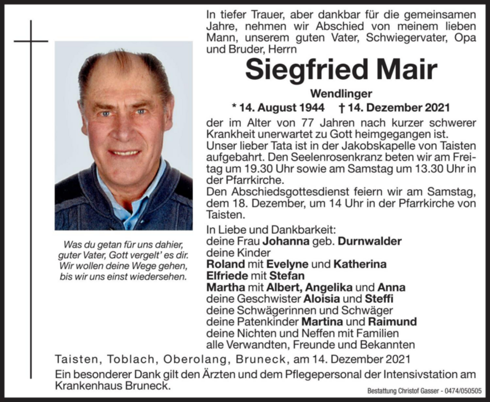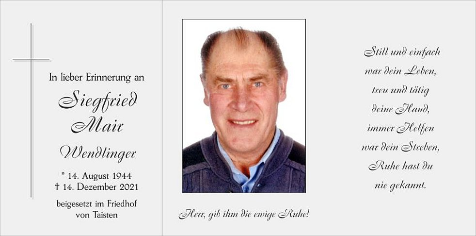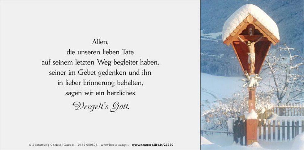 Unser lieber Tata ist ab Donnerstagnachmittag in der Jakobskapelle von Taisten aufgebahrt. Den Seelenrosenkranz beten wir am Donnerstag und am Freitag um 19.30 Uhr sowie am Samstag um 13.30 Uhr in der Pfarrkirche.