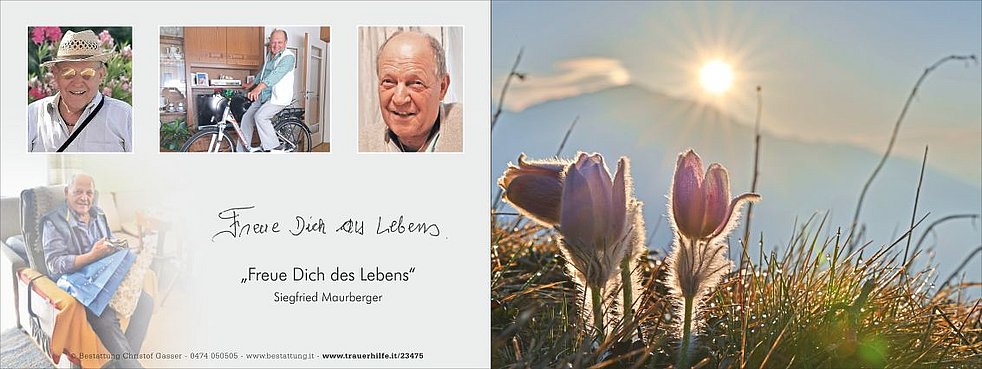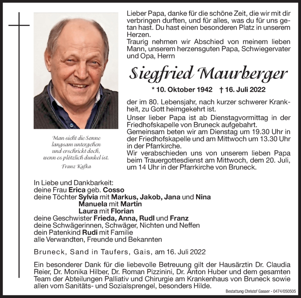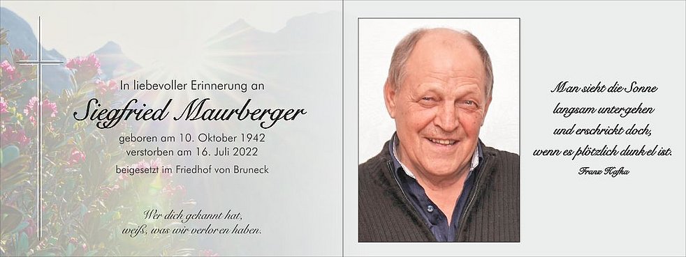 Wir verabschieden uns von unserem lieben Papa beim Trauergottesdienst am Mittwoch, dem 20. Juli, um 14 Uhr in der Pfarrkirche von Bruneck.