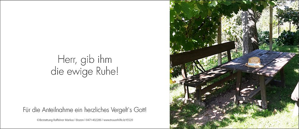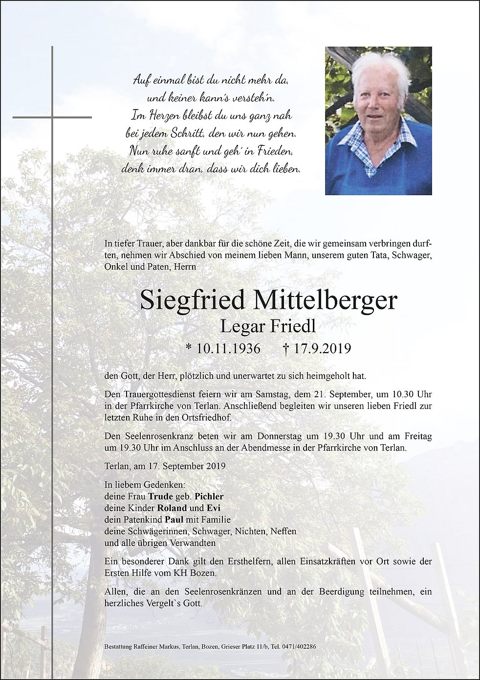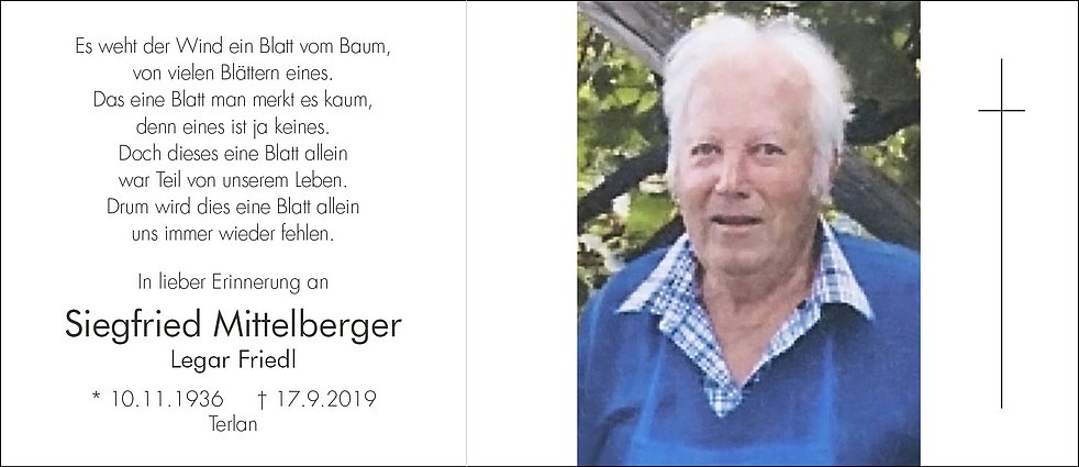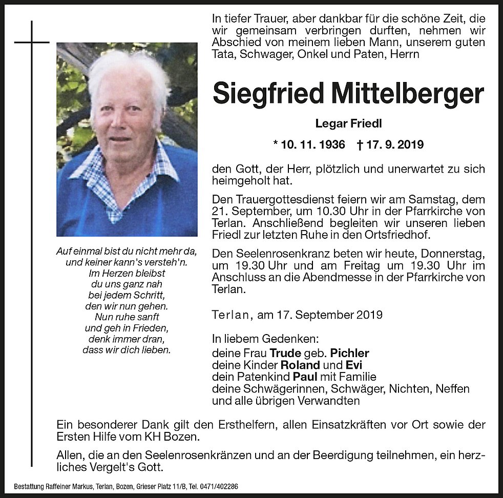 Den Trauergottesdienst feiern wir am Samstag, dem 21. September, um 10.30 Uhr in der Pfarrkirche von Terlan. Anschließend begleiten wir unseren lieben Friedl zur letzten Ruhe in den Ortsfriedhof.