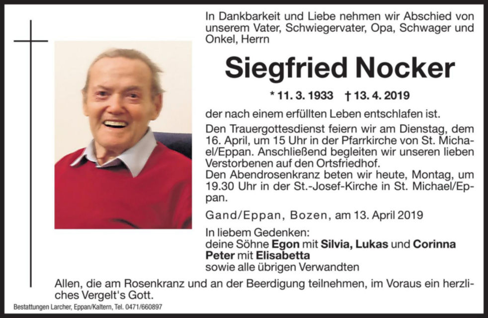 Den Trauergottesdienst feiern wir am Dienstag, dem 16. April um 15 Uhr in der Pfarrkirche von St. Michael/Eppan. Anschließend begleiten wir unseren lieben Verstorbenen auf den Ortsfriedhof.