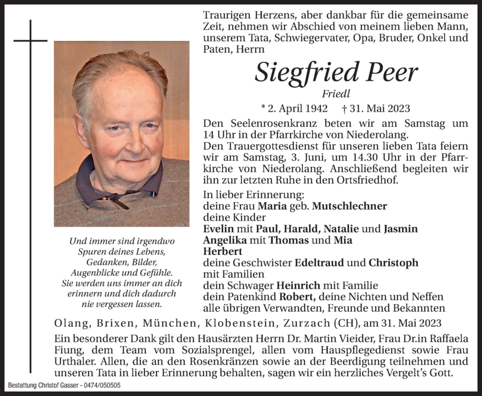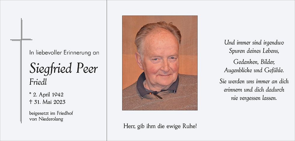 Den Trauergottesdienst für unseren lieben Tata feiern wir am Samstag, 3. Juni, um 14.30 Uhr in der Pfarrkirche von Niederolang. Anschließend begleiten wir ihn zur letzten Ruhe in den Ortsfriedhof.
