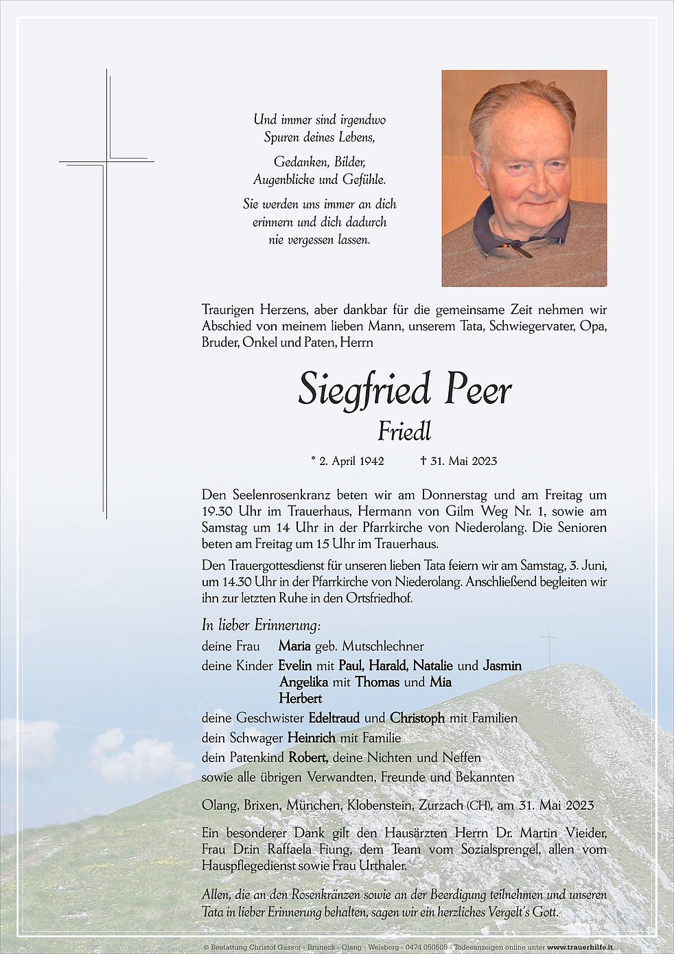 Ein besonderer Dank gilt den Hausärzten Herrn Dr. Martin Vieider, Frau Dr.in Raffaela Fiung, dem Team vom Sozialsprengel, allen vom Hauspflegedienst sowie Frau Urthaler.