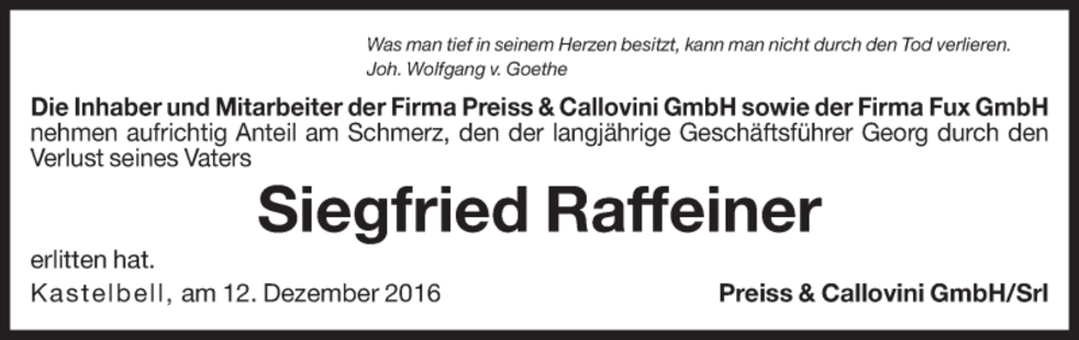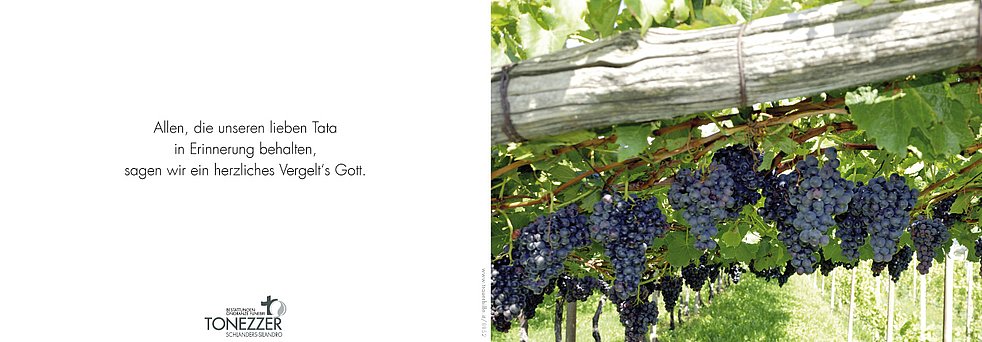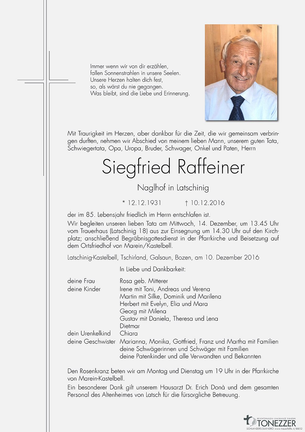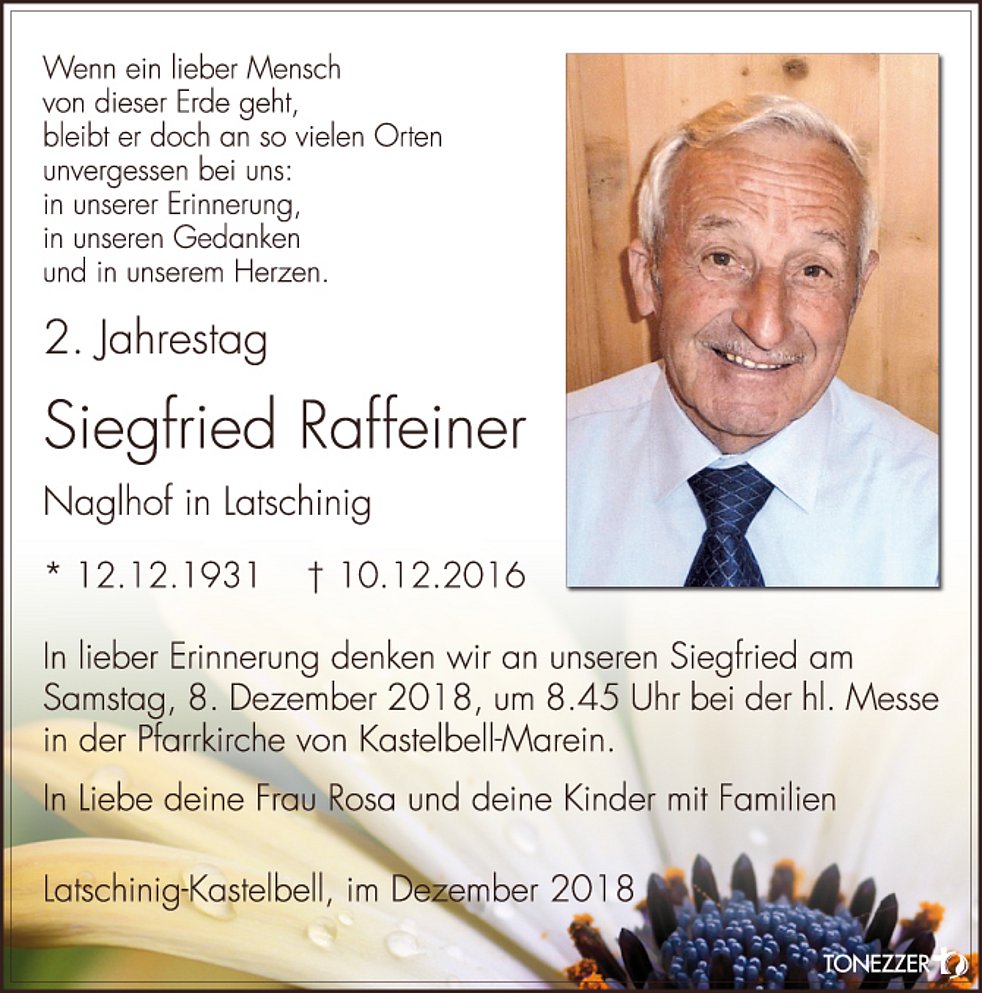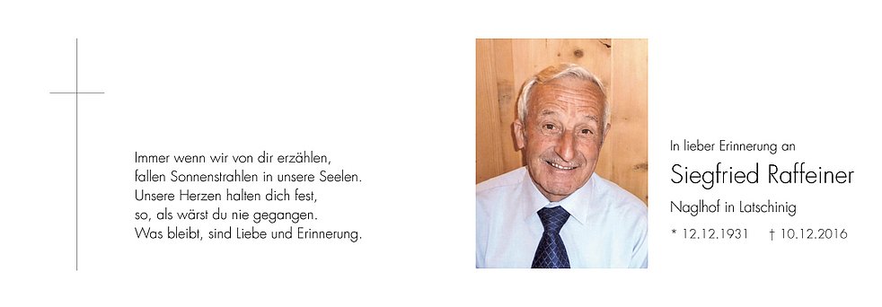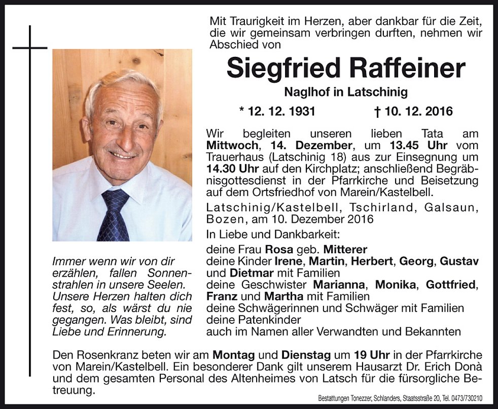 Wir begleiten unseren lieben Tata am Mittwoch, 14. Dezember, um 13.45 Uhr vom Trauerhaus (Latschinig 18) aus zur Einsegnung um 14.30 Uhr auf den Kirchplatz; anschließend Begräbnisgottesdienst in der Pfarrkirche und Beisetzung auf dem Ortsfriedhof von Marein/Kastelbell.