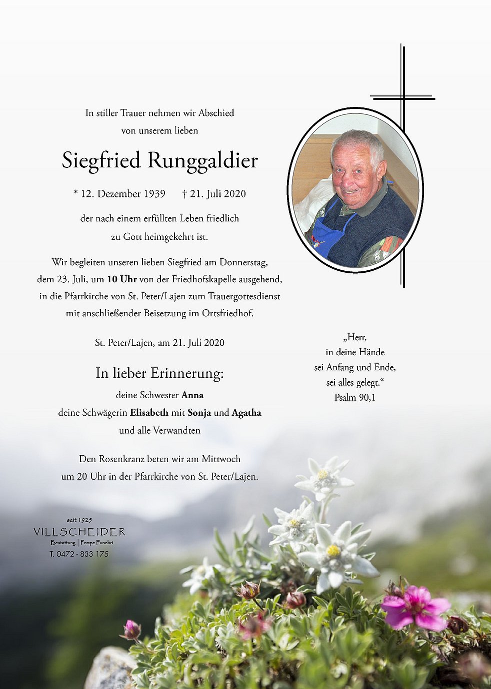 Begräbnisgottesdienst: 23.07. - 10:00 Uhr St. Peter/Lajen