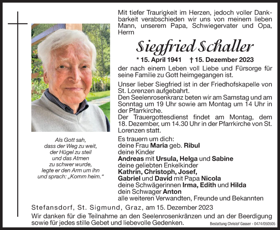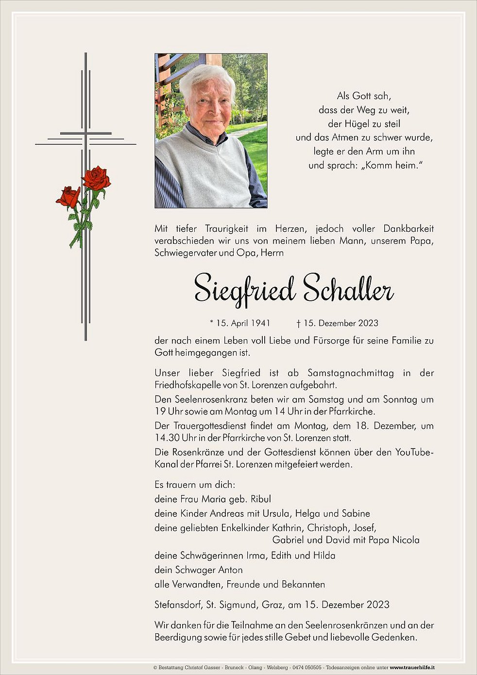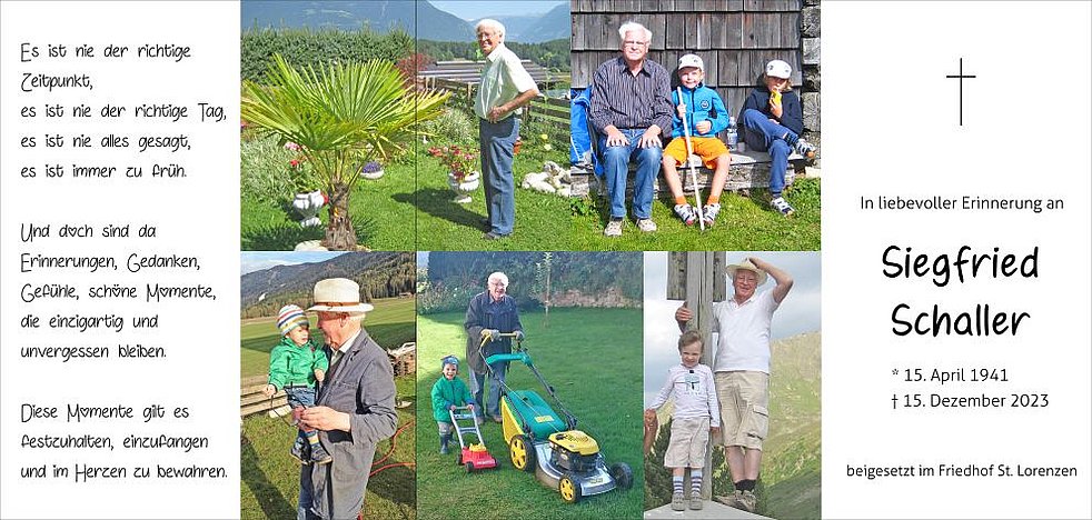 Unser lieber Siegfried ist ab Samstagnachmittag in der Friedhofskapelle von St. Lorenzen aufgebahrt.