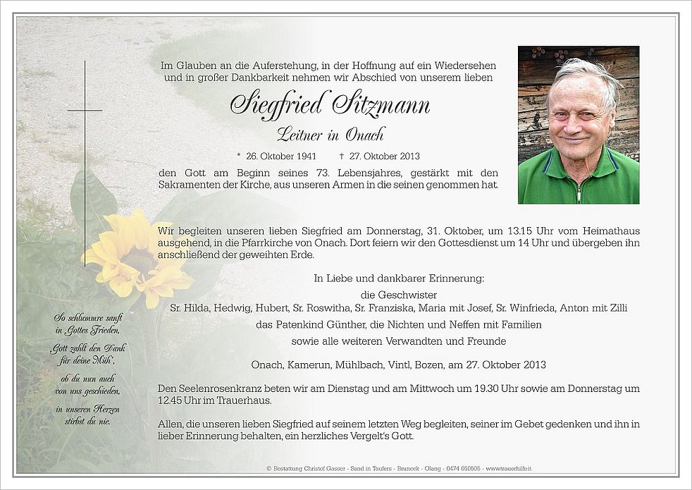 Wir begleiten unseren lieben Siegfried am Donnerstag, 31. Oktober, um 13.15 Uhr vom Heimathaus ausgehend, in die Pfarrkirche von Onach. Dort feiern wir den Gottesdienst um 14 Uhr und übergeben ihn anschließend der geweihten Erde.