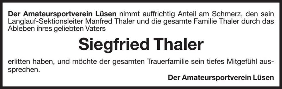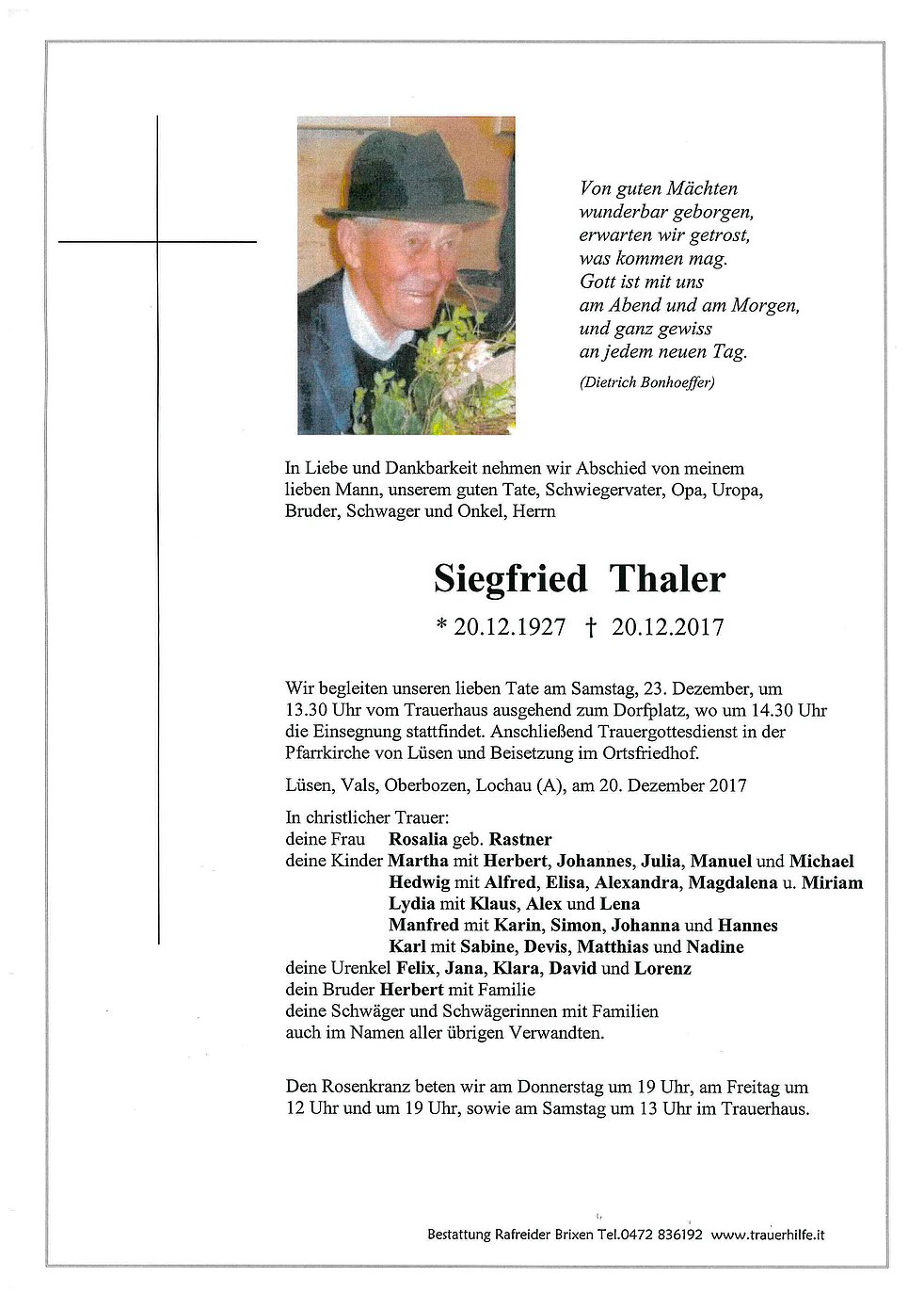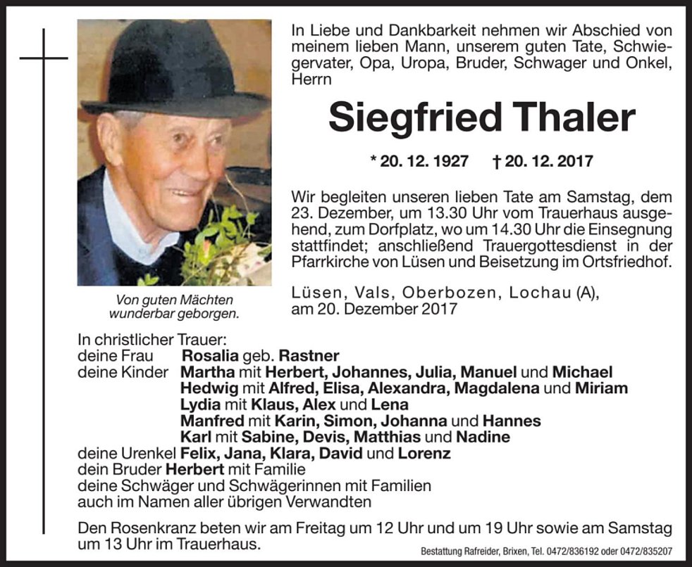 Wir begleiten unseren lieben Tate am Samstag, 23. Dezember, um 13.30 Uhr vom Trauerhaus ausgehend zum Dorfplatz, wo um 14.30 Uhr die Einsegnung stattfindet. Anschließend Trauergottesdienst in der Pfarrkirche von Lüsen und Beisetzung im Ortsfriedhof.