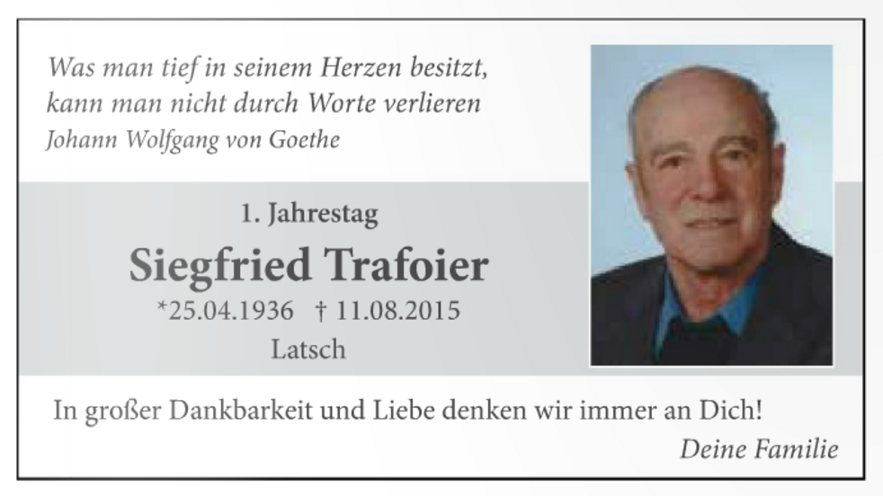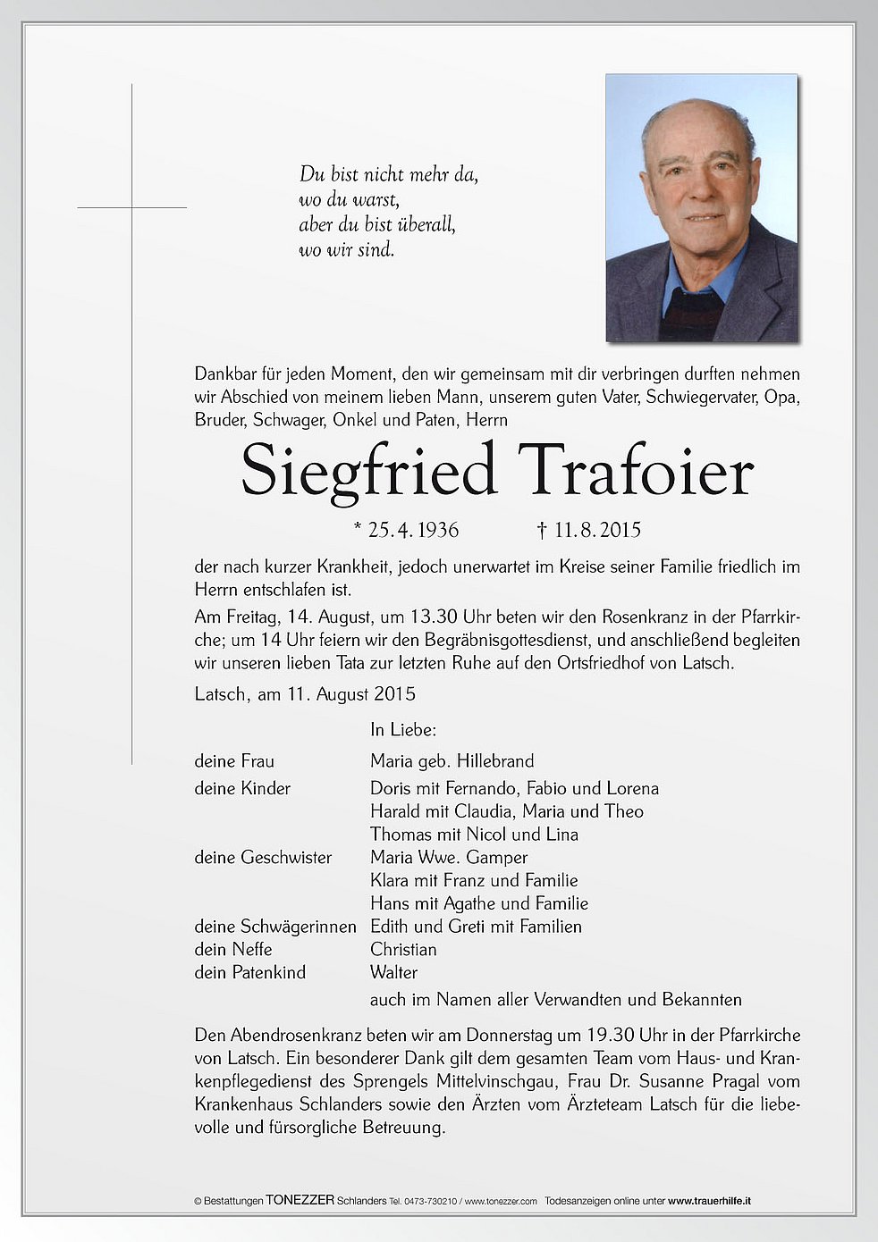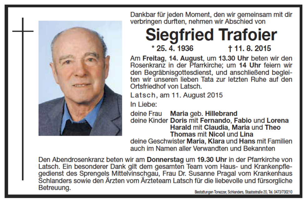 Am Freitag, 14. August, um 13.30 Uhr beten wir den Rosenkranz in der Pfarrkirche; um 14 Uhr feiern wir den Begräbnisgottesdienst, und anschließend begleiten wir unseren lieben Tata zur letzten Ruhe auf den Ortsfriedhof von Latsch.