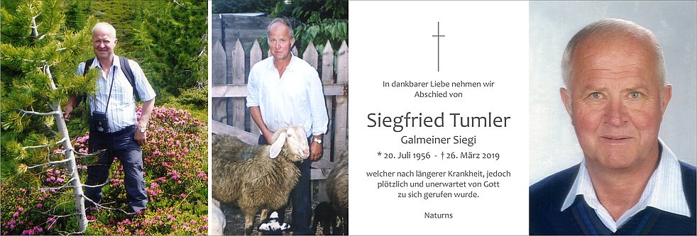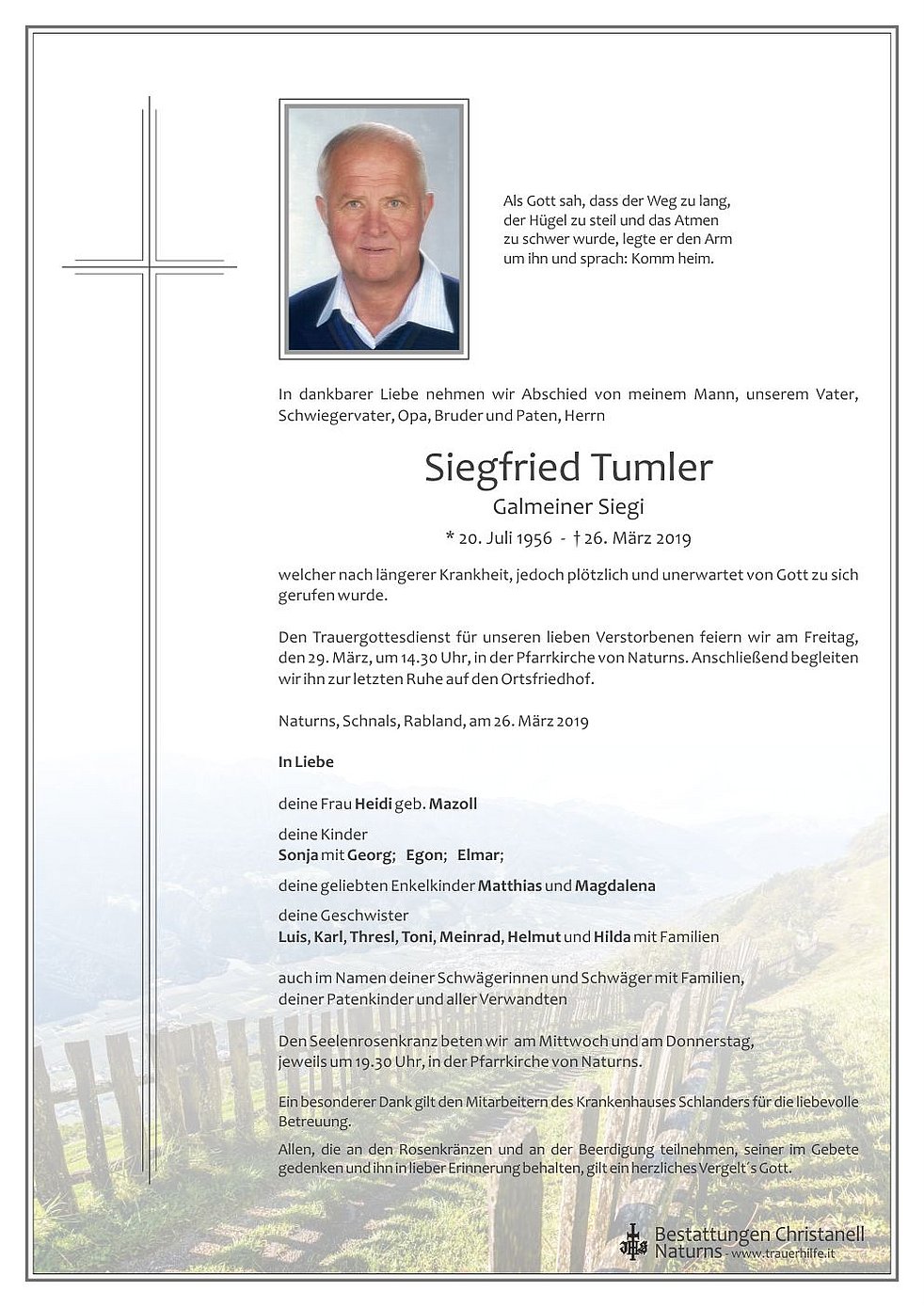 Den Trauergottesdienst für unseren lieben Verstorbenen feiern wir am Freitag, den 29. März, um 14.30 Uhr, in der Pfarrkirche von Naturns. Anschließend begleiten wir ihn zur letzten Ruhe auf den Ortsfriedhof.