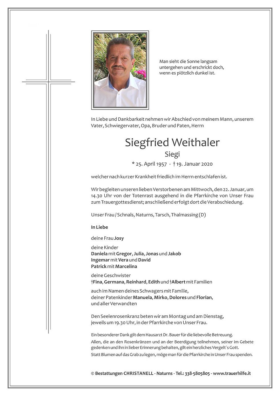 Wir begleiten unseren lieben Verstorbenen am Mittwoch, den 22. Januar, um 14.30 Uhr von der Totenrast ausgehend in die Pfarrkirche von Unser Frau zum Trauergottesdienst; anschließend erfolgt dort die Verabschiedung.