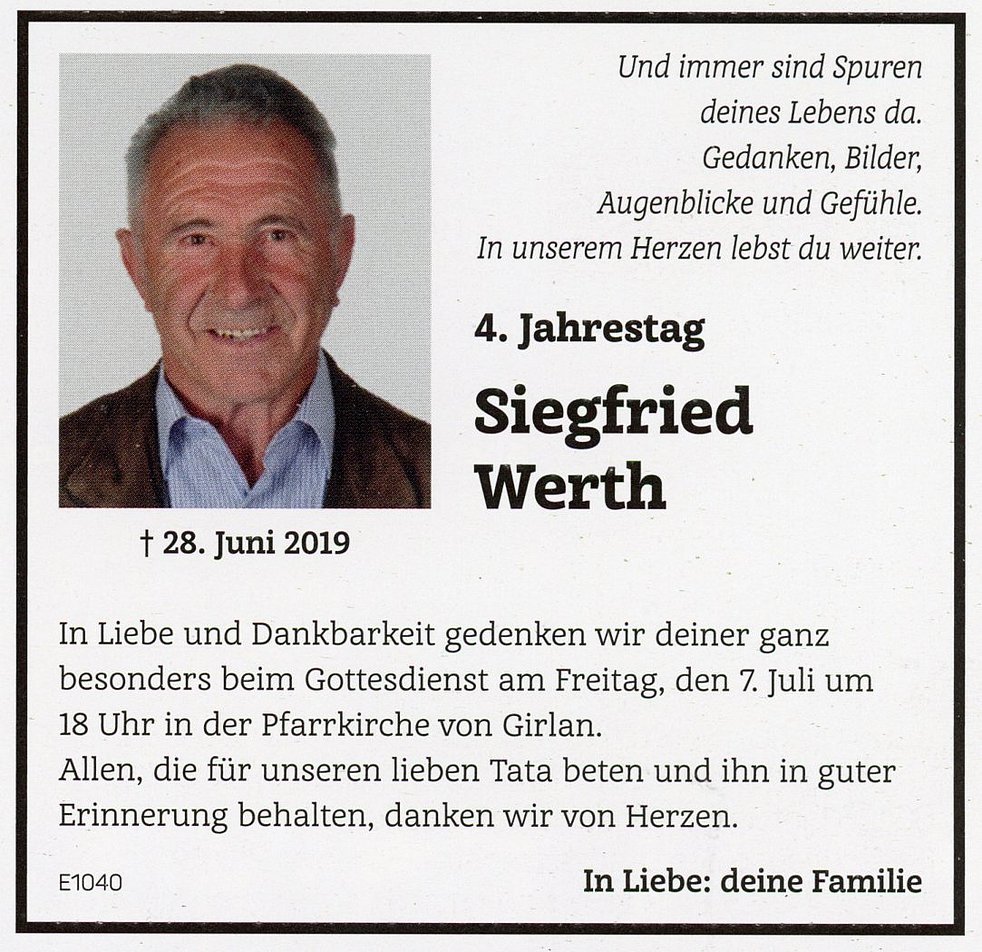 Den Trauergottesdienst feiern wir am Dienstag, dem 2. Juli um 16 Uhr in der Pfarrkirche von Girlan. Anschließend begleiten wir unseren lieben Verstorbenen auf den Ortsfriedhof.