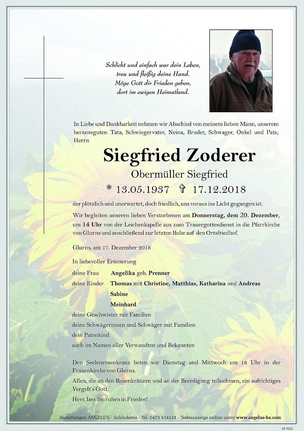 Wir begleiten unseren lieben Verstorbenen am Donnerstag, dem 20. Dezember, um 14 Uhr von der Leichenkapelle aus zum Trauergottesdienst in die Pfarrkirche von Glurns und anschließend zur letzten Ruhe auf den Ortsfriedhof.