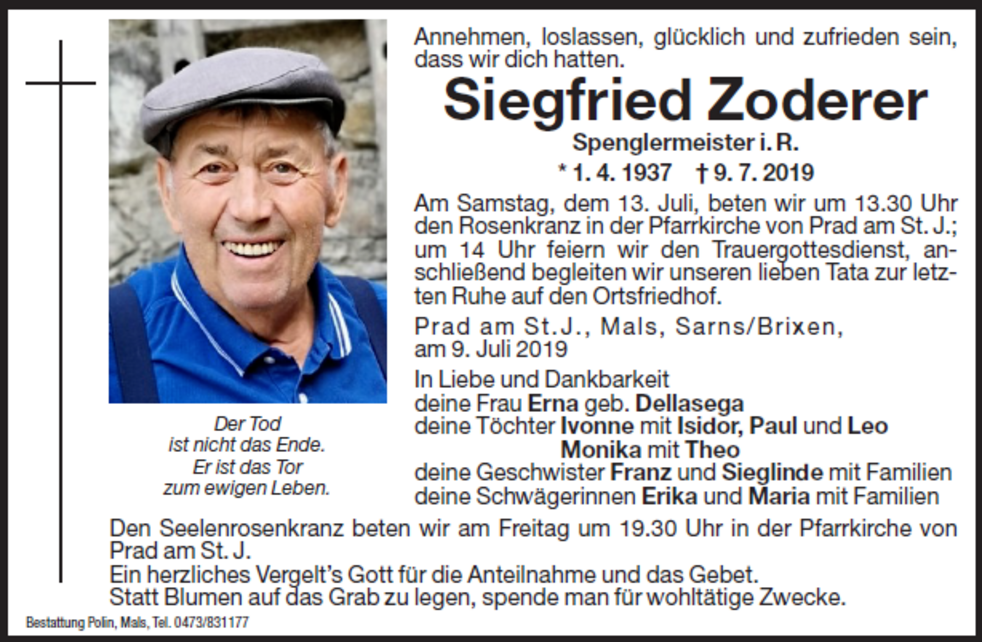 Anstelle von Blumen auf das Grab, spende man für wohltätige Zwecke.