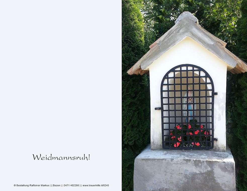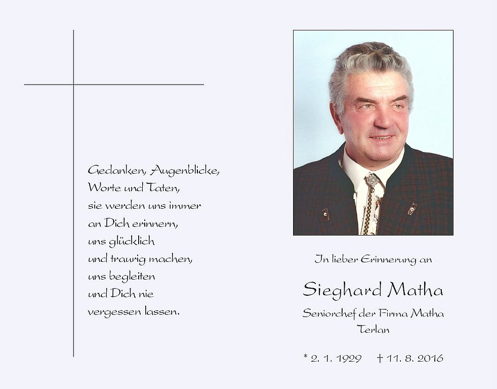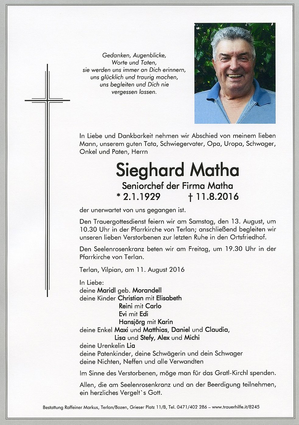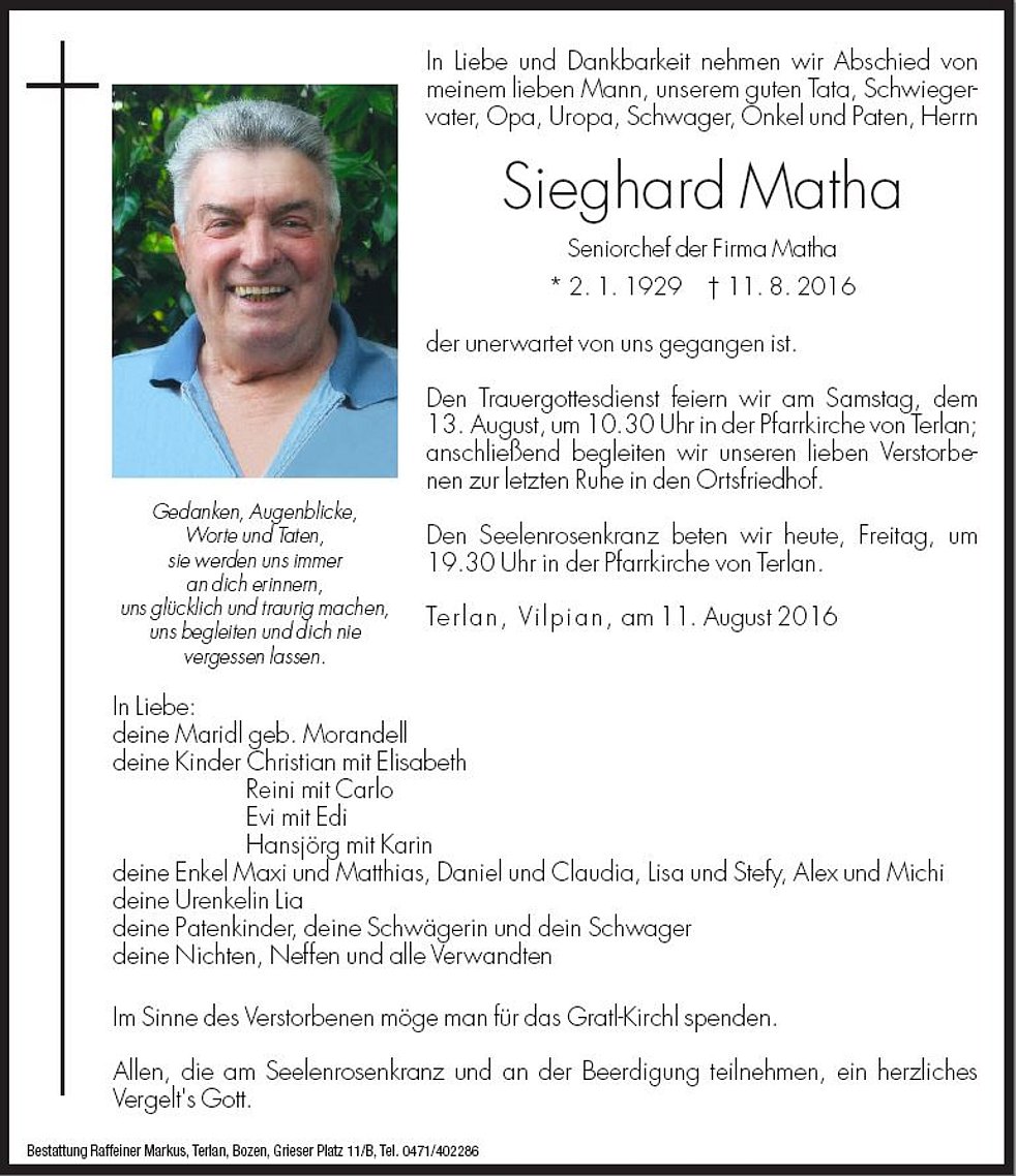 Den Trauergottesdienst feiern wir am Samstag, den 13. August, um 10.30 Uhr in der Pfarrkirche von Terlan; anschließend begleiten wir unseren lieben Verstorbenen zur letzten Ruhe in den Ortsfriedhof.