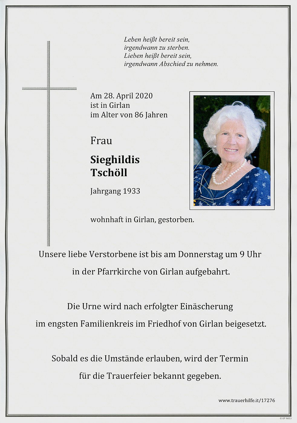 Die Urne wird nach erfolgter Einäscherung im engsten Familienkreis im Friedhof von Girlan beigesetzt. Den Trauergottesdienst feiern wir zu einem späteren Zeitpunkt.