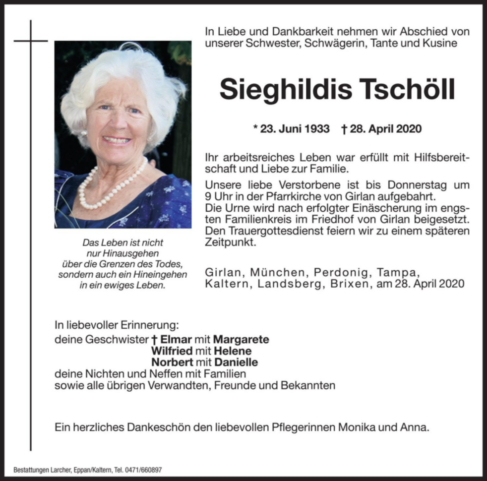 ihr arbeitsreiches Leben war erfüllt mit Hilfsbereitschaft und Liebe zur Familie. Unsere liebe Verstorbene ist bis Donnerstag um 9 Uhr in der Pfarrkirche von Girlan aufgebahrt.