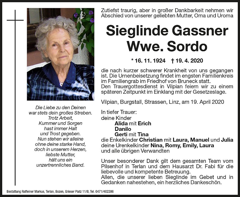 Unser besonderer Dank gilt dem gesamten Team vom Pilsenhof in Terlan und dem Hausarzt Dr. Fabi für die liebevolle und kompetente Betreuung. Allen, die unserer lieben Sieglinde im Gebet und im Gedanken nahestehen, ein herzliches Dankeschön.