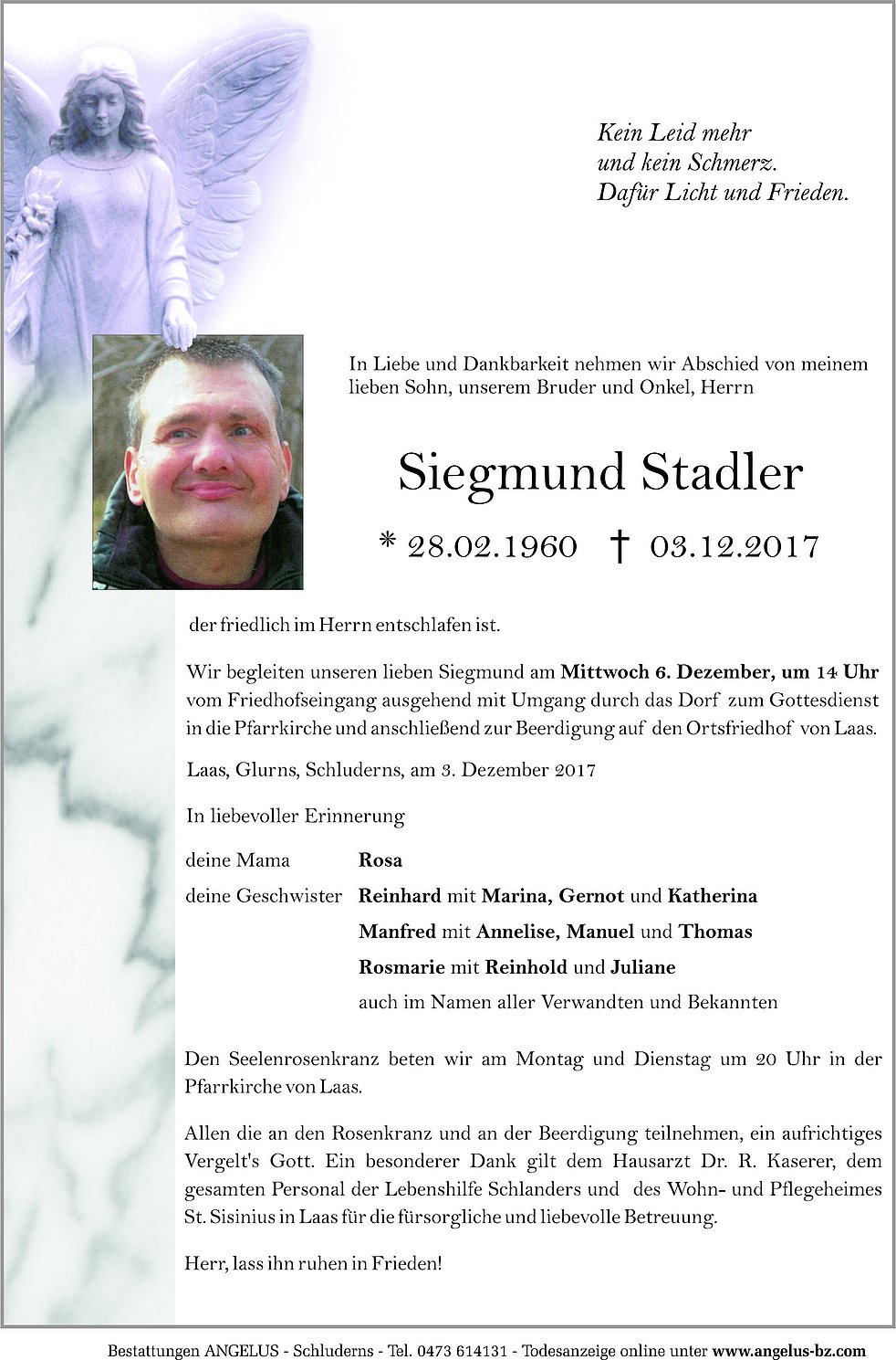 Wir begleiten unseren lieben Siegmund am Mittwoch 6. Dezember, um 14 Uhr vom Friedhofseingang ausgehend mit Umgang durch das Dorf zum Gottesdienst in die Pfarrkirche und anschließend zur Beerdigung auf den Ortsfriedhof von Laas.
