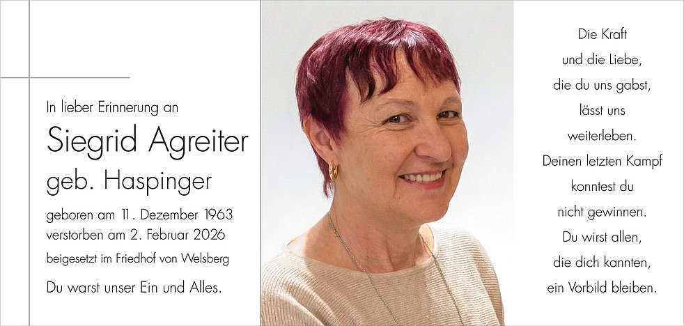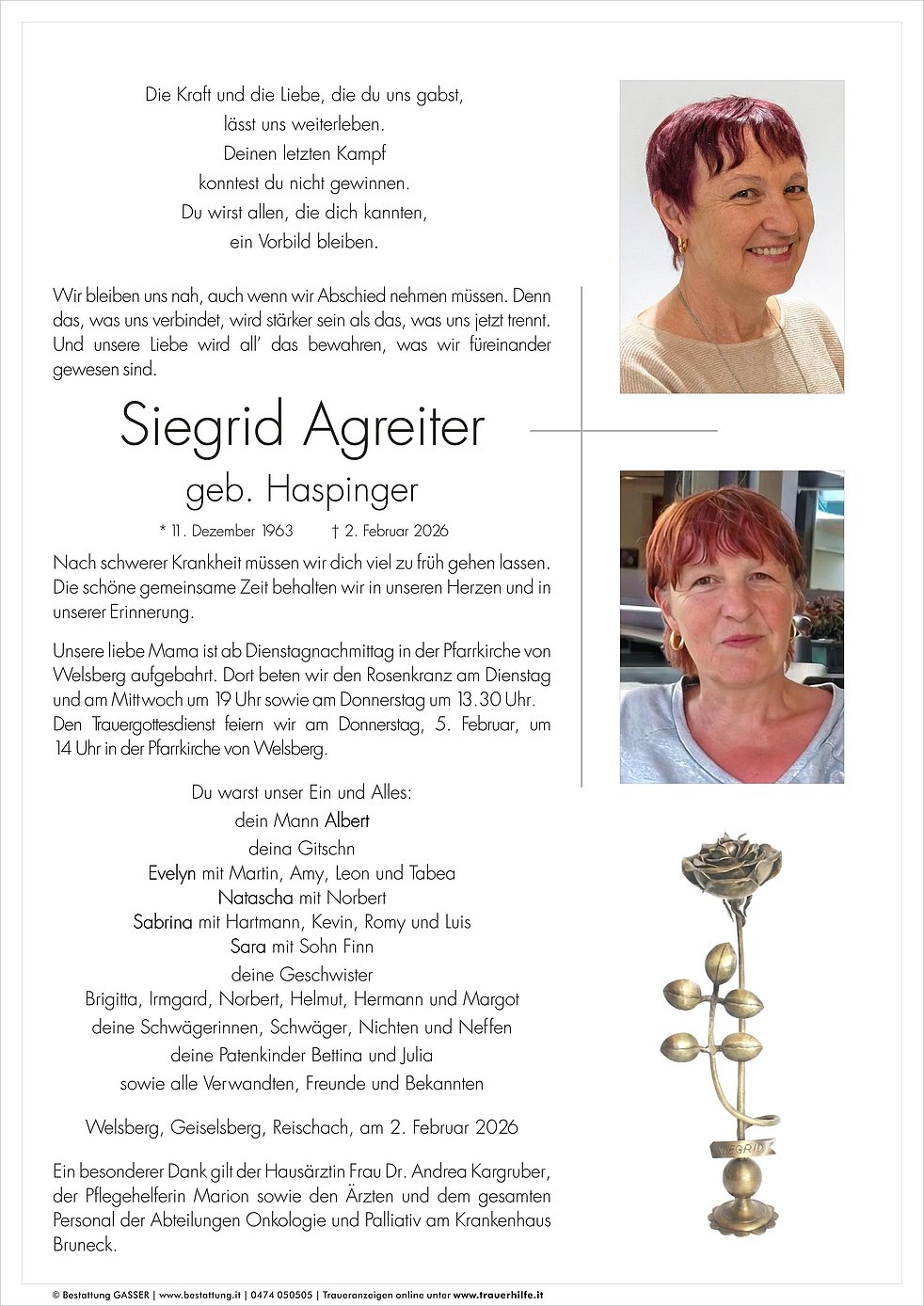 Den Trauergottesdienst feiern wir am Donnerstag, 5. Februar, um 14 Uhr in der Pfarrkirche von Welsberg.