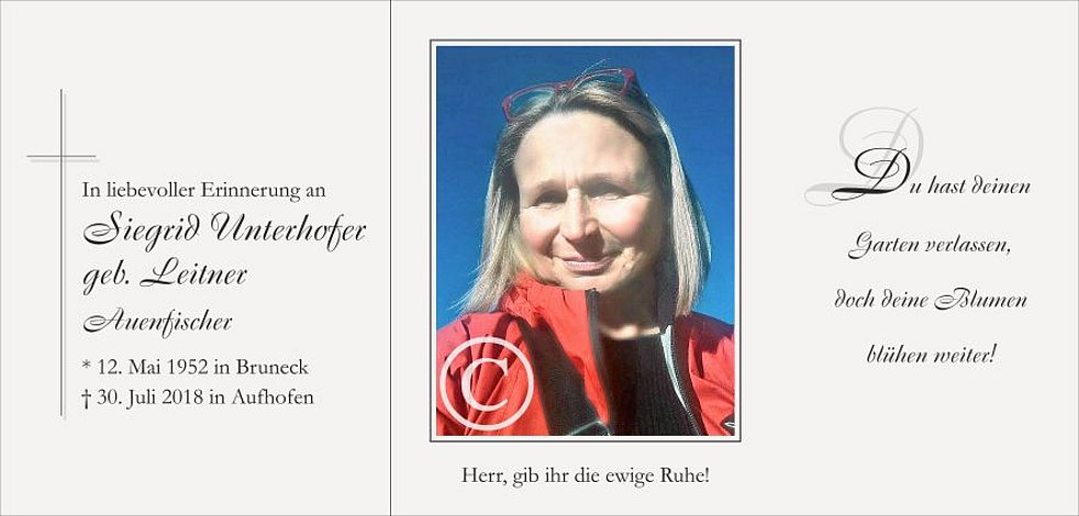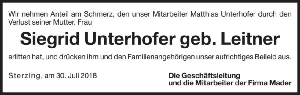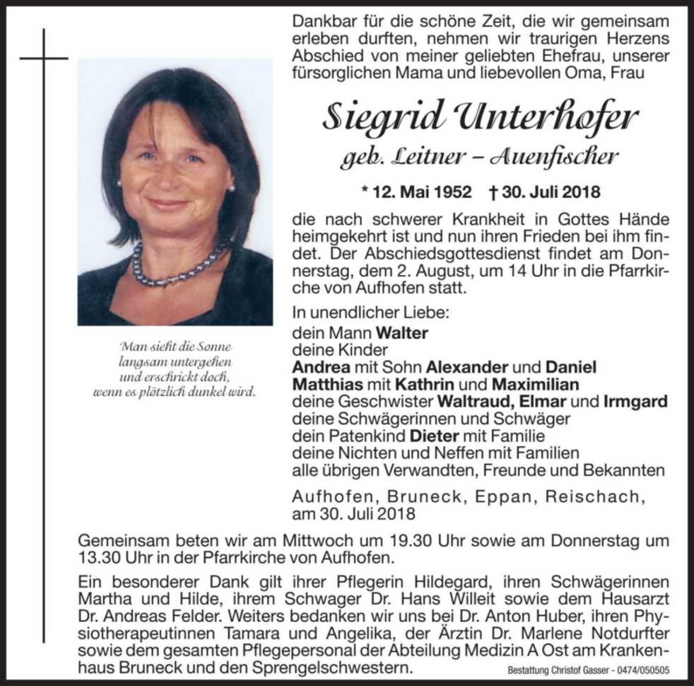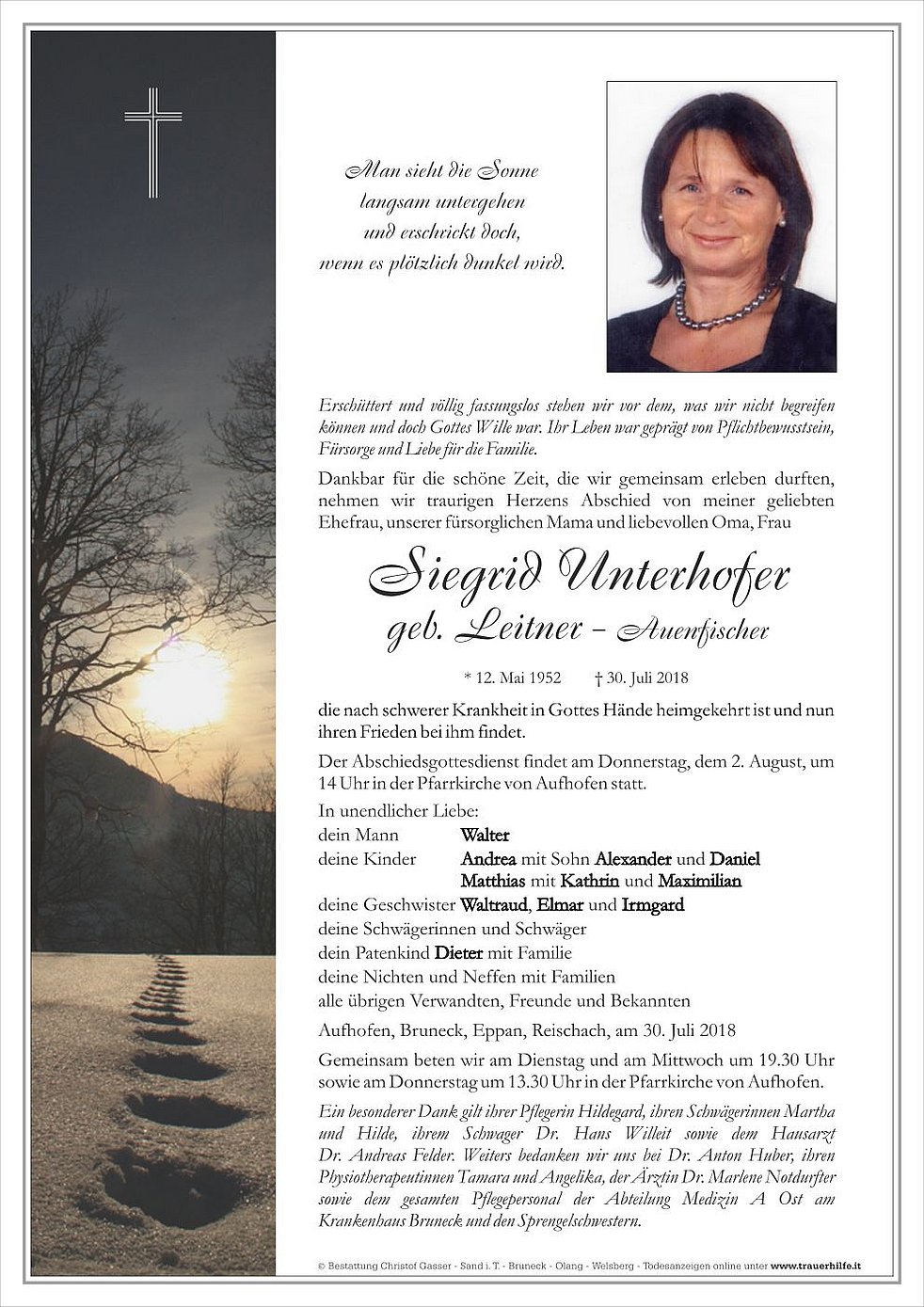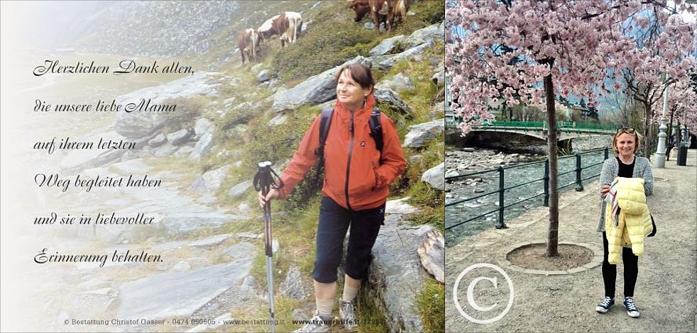 Ein besonderer Dank gilt ihrer Pflegerin Hildegard, ihren Schwägerinnen Martha und Hilde, ihrem Schwager Dr. Hans Willeit sowie dem Hausarzt Dr. Andreas Felder. Weiters bedanken wir uns bei Dr. Anton Huber, ihren Physiotherapeutinnen Tamara und Angelika, der Ärztin Dr. Marlene Notdurfter sowie dem gesamten Pflegepersonal der Abteilung Medizin A Ost am Krankenhaus Bruneck und den Sprengelschwestern.