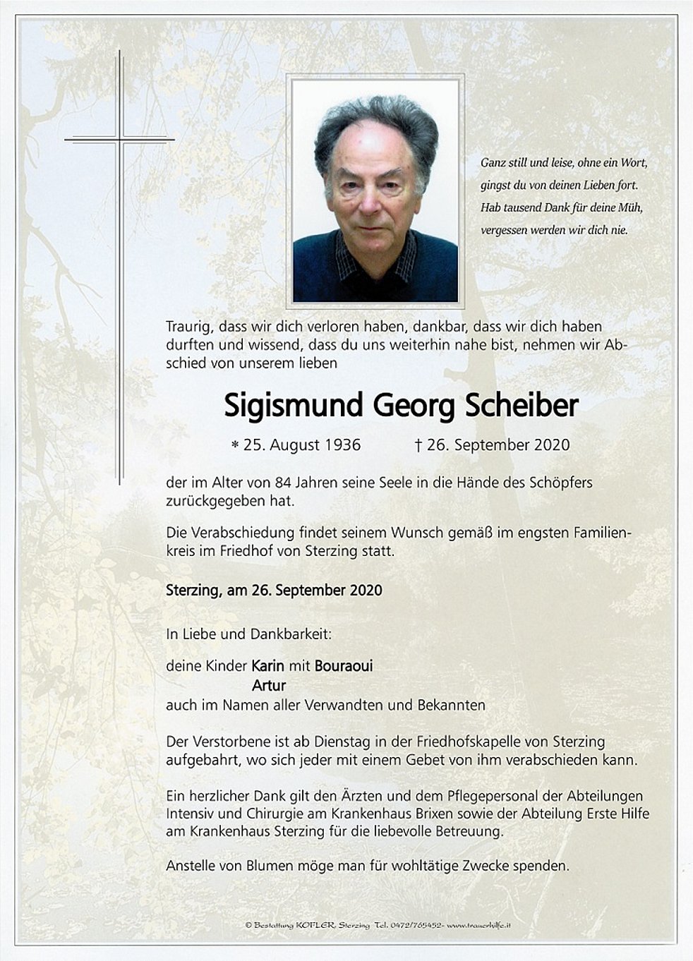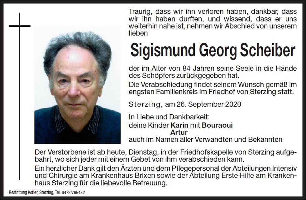 Die Verabschiedung findet seinem Wunsch gemäß im engsten Familienkreis im Friedhof von Sterzing statt.