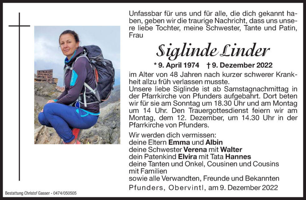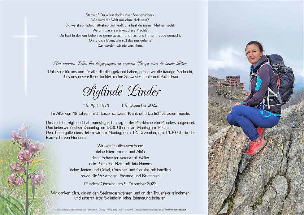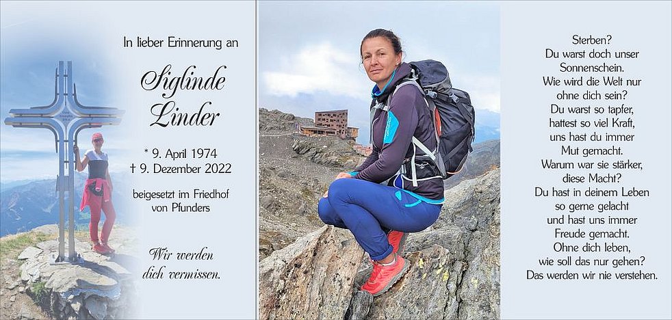 Unsere liebe Siglinde ist ab Samstagnachmittag in der Pfarrkirche von Pfunders aufgebahrt.