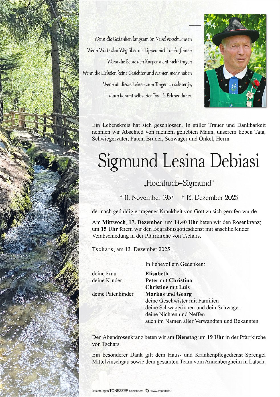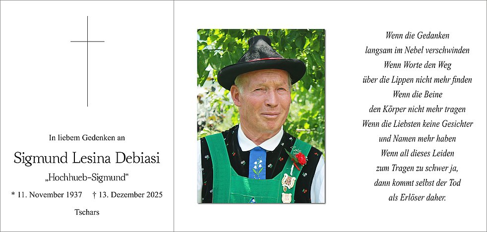 Am Mittwoch, 17. Dezember, um 14.40 Uhr beten wir den Rosenkranz; um 15 Uhr feiern wir den Begräbnisgottesdienst mit anschließender Verabschiedung in der Pfarrkirche von Tschars.