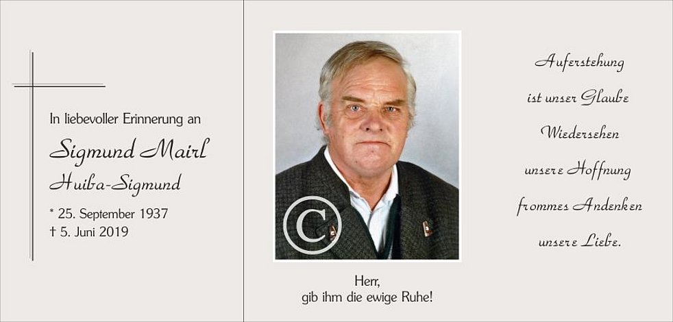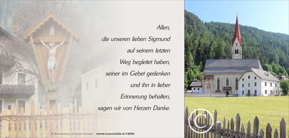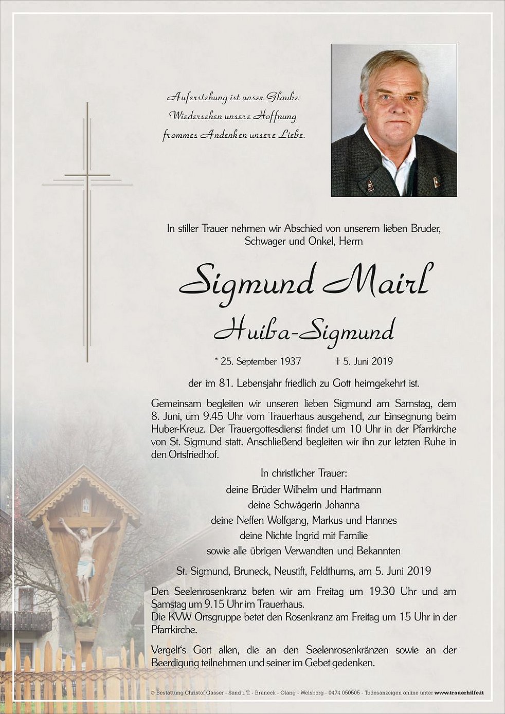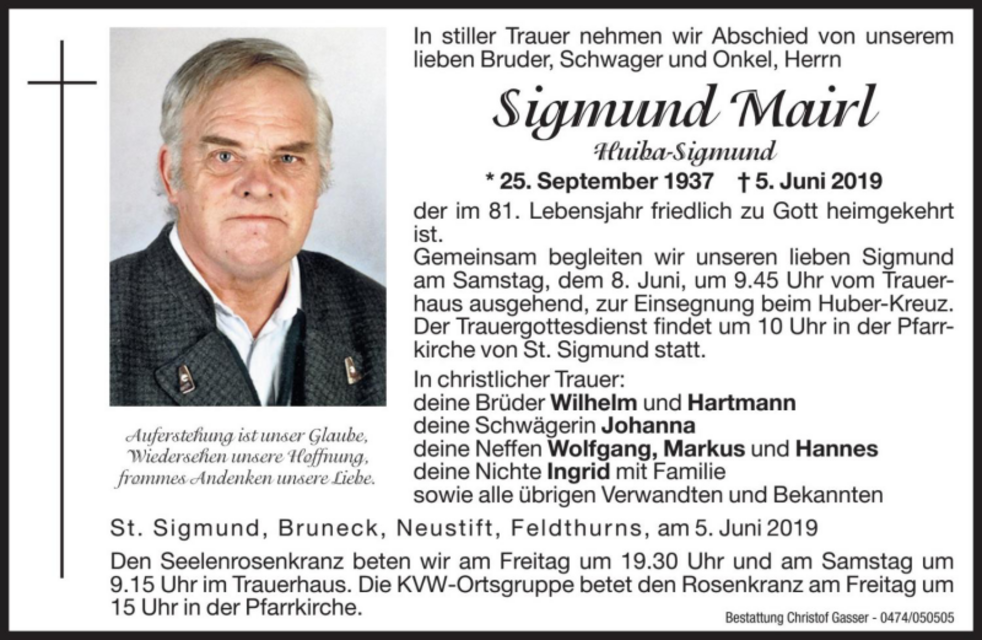 Gemeinsam begleiten wir unseren lieben Sigmund am Samstag, dem 8. Juni, um 9.45 Uhr vom Trauerhaus ausgehend, zur Einsegnung beim Huber-Kreuz. Der Trauergottesdienst findet um 10 Uhr in der Pfarrkirche von St. Sigmund statt. Anschließend begleiten wir ihn zur letzten Ruhe in den Ortsfriedhof.