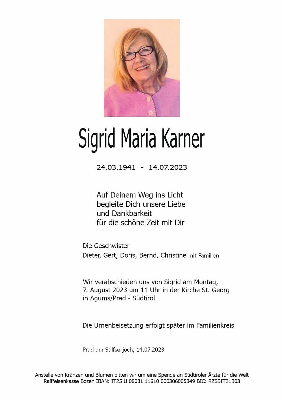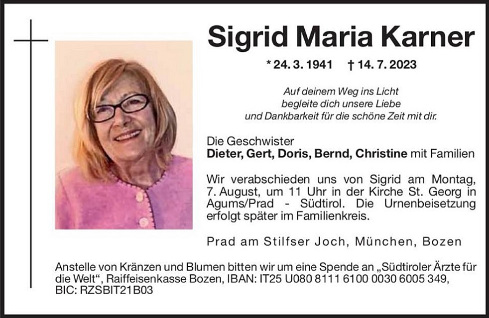 Anstelle von Kränzen und Blumen bitten wir um eine Spende an Südtiroler Ärzte für die Welt