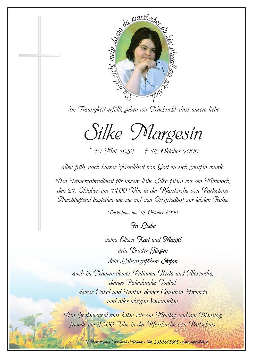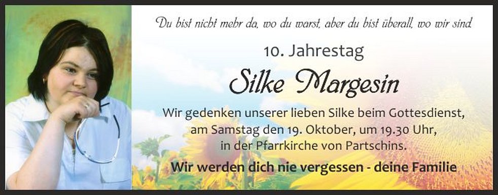 Den Trauergottesdienst für unsere liebe Silke feiern wir am Mittwoch, den 21. Oktober, um 14.00 Uhr, in der Pfarrkirche von Partschins. Anschließend begleiten wir sie auf den Ortsfriedhof zur letzten Ruhe.