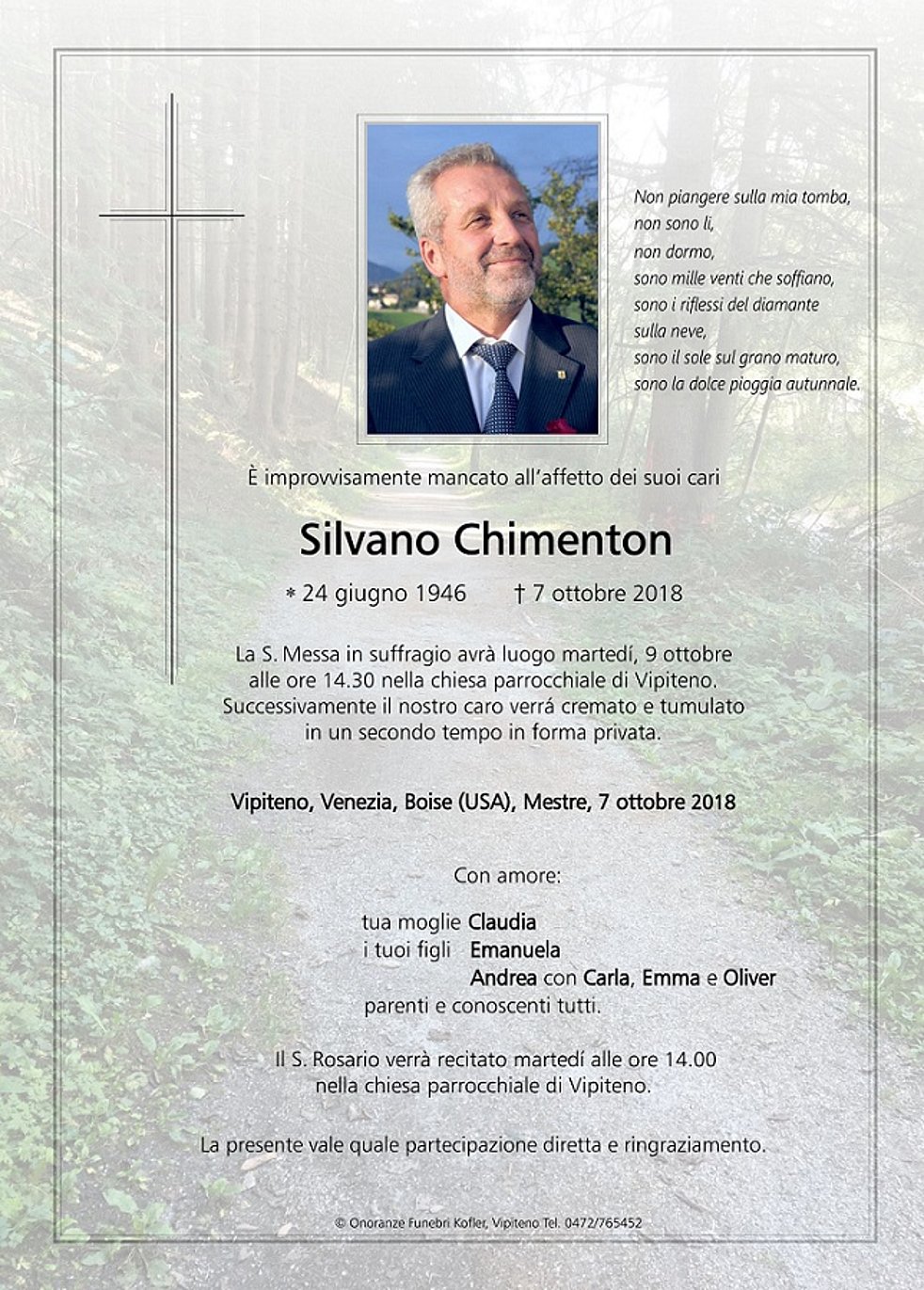 La S. Messa in suffragio avrà luogo martedí, 9 ottobre, alle ore 14.30 nella chiesa parrocchiale di Vipiteno. Successivamente il nostro caro verrà cremato e tumulato in un secondo tempo in forma privata.