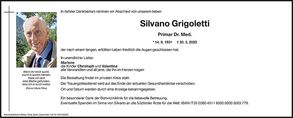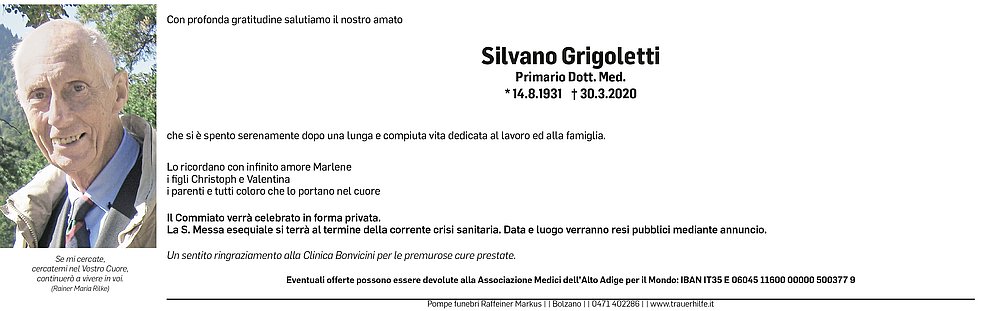 Eventuelle Spenden, im Sinne von Silvano, an die Südtiroler Ärzte für die Welt: IBAN IT35 E 06045 11600 00000 500377 9