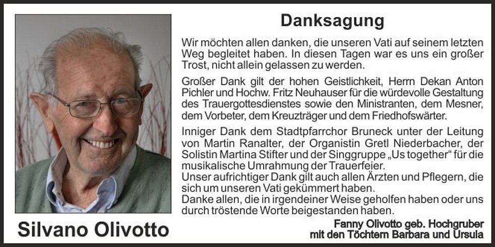 Den Trauergottesdienst feiern wir am Samstag, 17. April, um 14 Uhr in der Pfarrkirche von Bruneck. Anschließend begleiten wir unseren lieben Vati zur letzten Ruhe in den Stadtfriedhof.