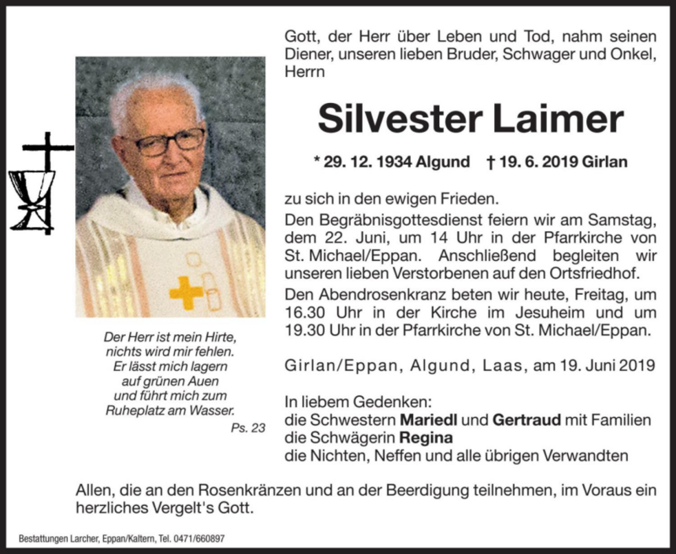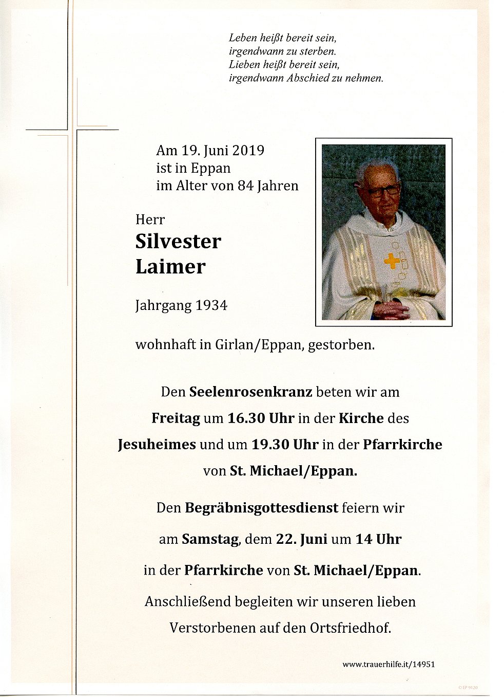 Den Begräbnisgottesdienst feiern wir am Samstag, den 22. Juni, um 14 Uhr in der Pfarrkirche von St. Michael/Eppan. Anschließend begleiten wir unseren lieben Verstorbenen auf den Ortsfriedhof.