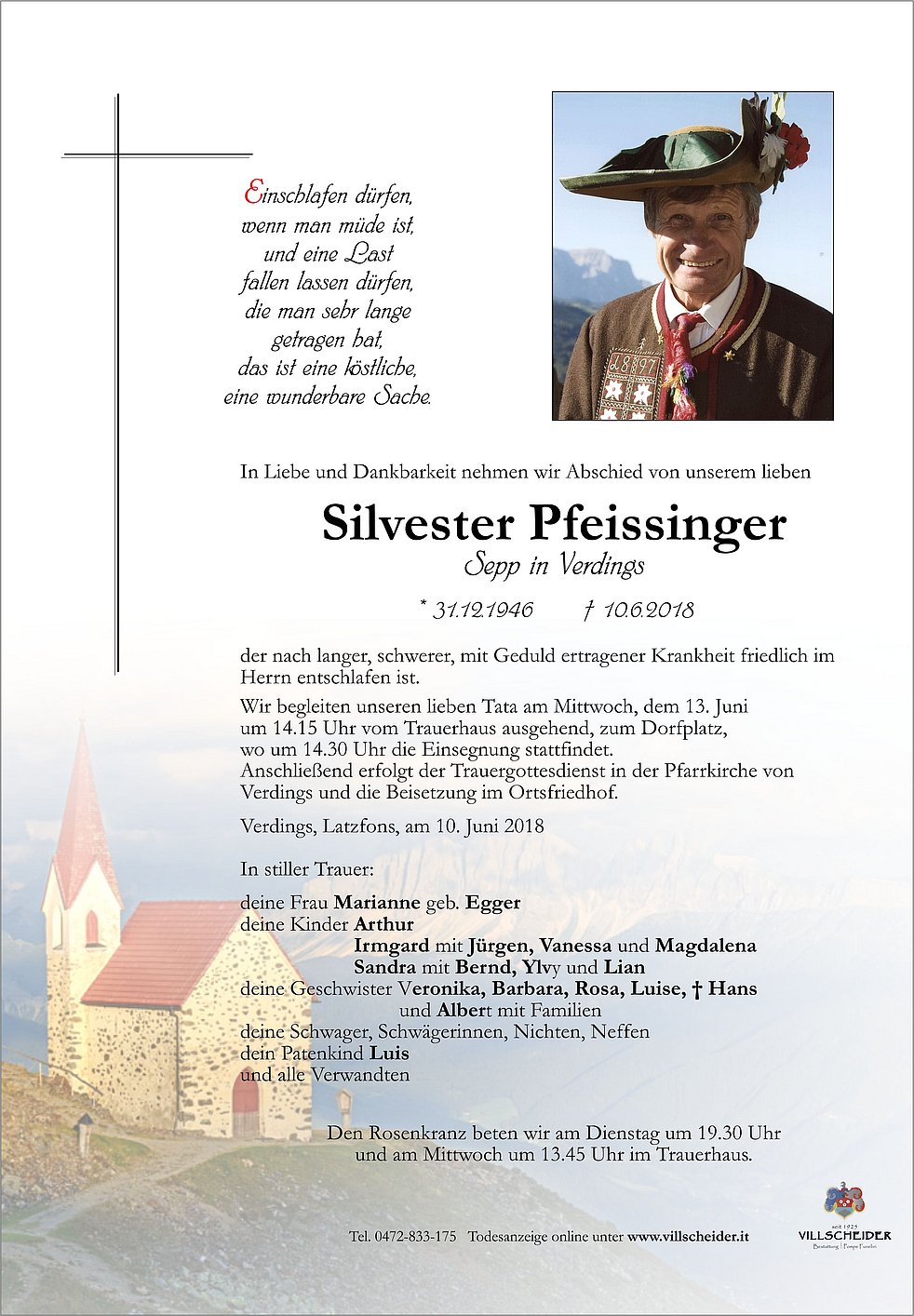 Anschließend erfolgt der Trauergottesdienst in der Pfarrkirche von Verdings und die Beisetzung im Ortsfriedhof.