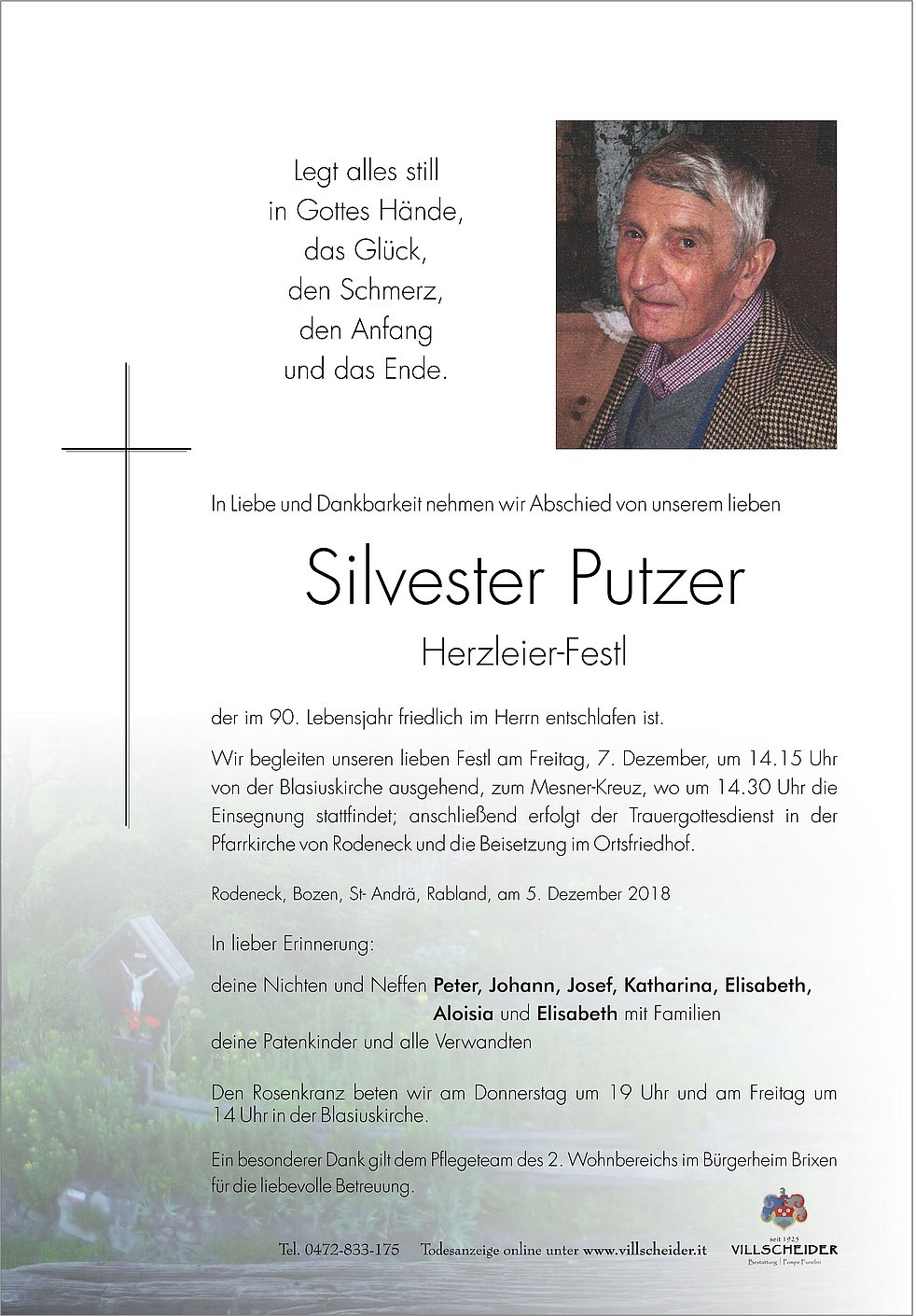 Begräbnisgottesdienst: 07.12. - 14:30 Uhr Rodeneck