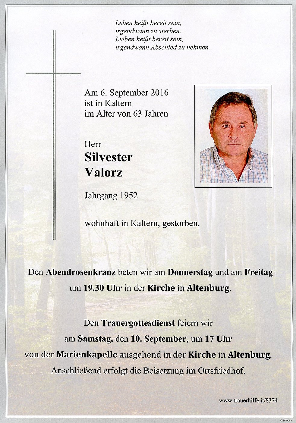 Wir begleiten unseren lieben Verstorbenen, von der Marienkapelle ausgehend, zum Trauergottesdienst am Samstag, den 10. September um 17 Uhr in der Kirche in Altenburg. Anschließend verabschieden wir unseren lieben Verstorbenen auf dem Kirchplatz und setzen ihn im Ortsfriedhof bei.