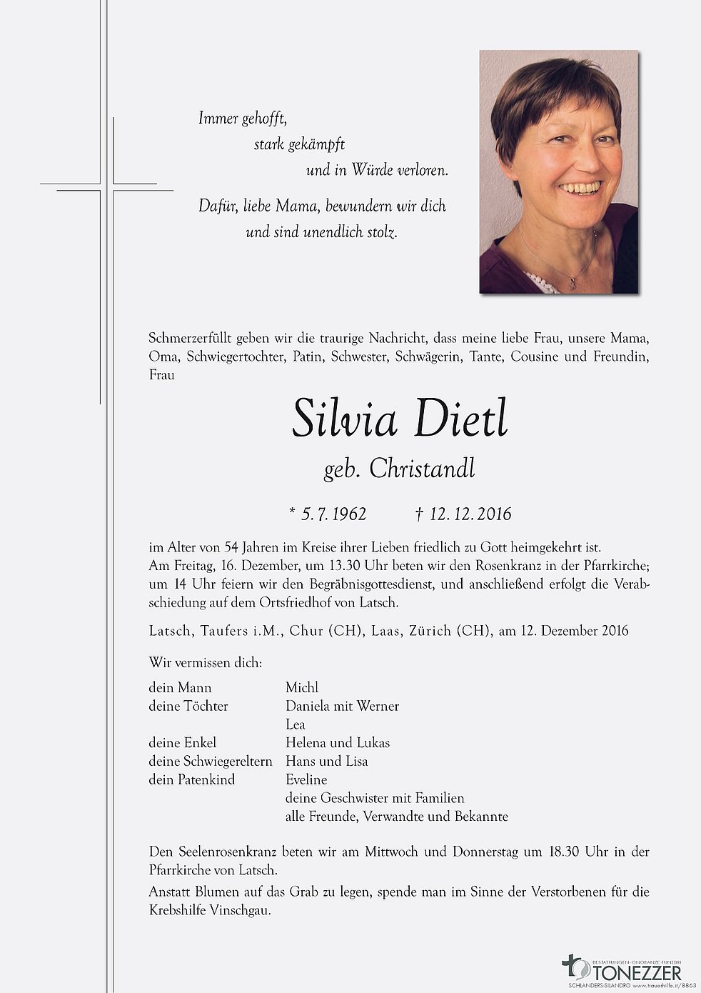 Schmerzerfüllt geben wir die traurige Nachricht, dass meine liebe Frau, unsere Mama, Oma, Schwiegertochter, Patin, Schwester, Schwägerin, Tante, Cousine und Freundin, Frau