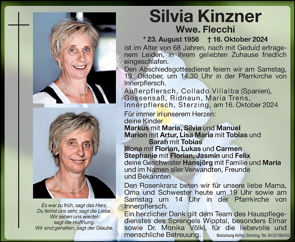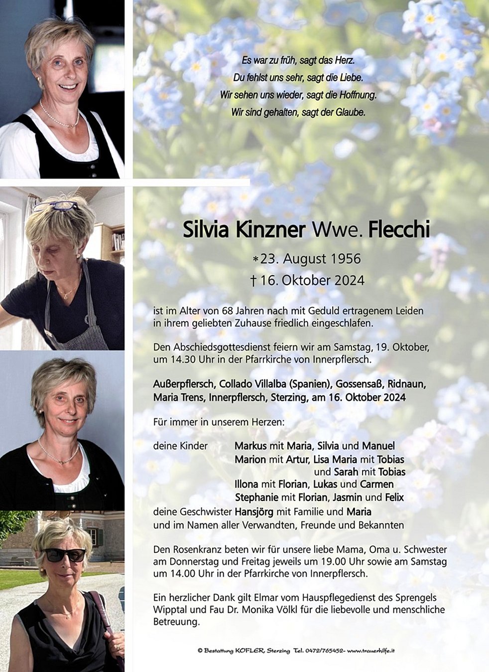 Den Rosenkranz beten wir für unsere liebe Mama, Oma und Schwester am Donnerstag und Freitag jeweils um 19.00 Uhr sowie am Samstag um 14.00 Uhr in der Pfarrkirche von Innerpflersch.