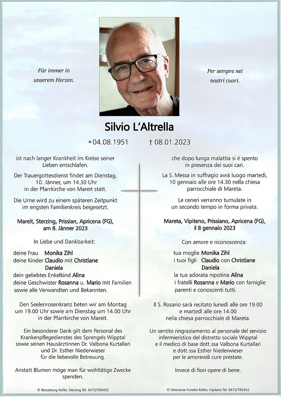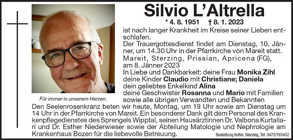Ein besonderer Dank gilt dem Personal des Krankenpflegedienstes des Sprengels Wipptal sowie seinen Hausärztinnen Dr. Valbona Kurtallari und Dr. Esther Niederwieser für die liebevolle Betreuung.