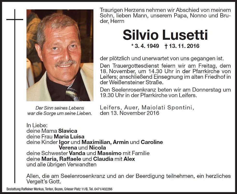 Den Trauergottesdienst feiern wir am Freitag, den 18. November, um 14.30 Uhr in der Pfarrkirche von Leifers mit anschlieβender Einsegnung im alten Friedhof in der Weisensteinerstrasse.