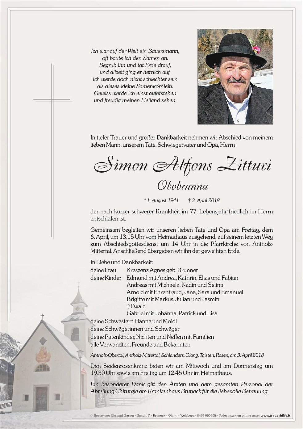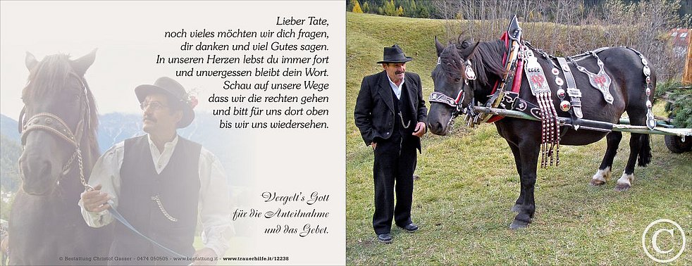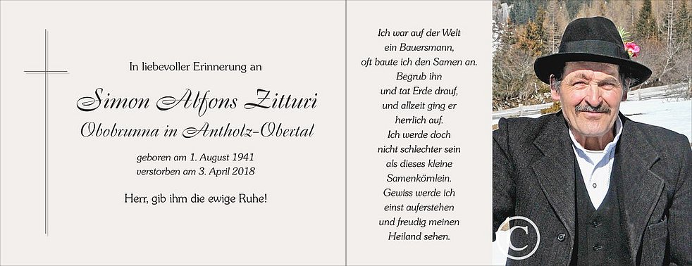 Gemeinsam begleiten wir unseren lieben Tate und Opa am Freitag, dem 6. April, um 13.15 Uhr vom Heimathaus ausgehend, auf seinem letzten Weg zum Abschiedsgottesdienst um 14 Uhr in die Pfarrkirche von Antholz-Mittertal. Anschließend übergeben wir ihn der geweihten Erde.