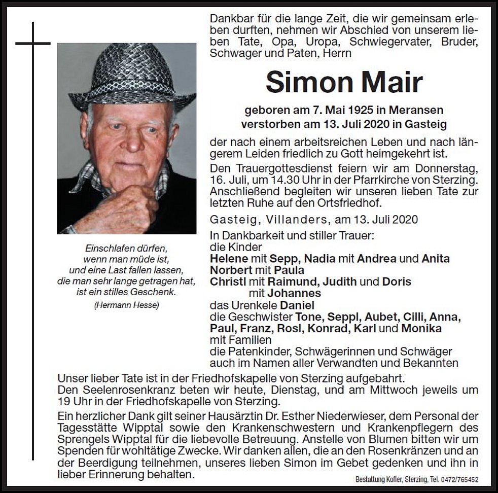 Ein herzlicher Dank gilt seiner Hausärztin Dr. Esther Niederwieser, dem Personal der Tagesstätte Wipptal sowie den Krankenschwestern und Krankenpflegern des Sprengels Wipptal für die liebevolle Betreuung.