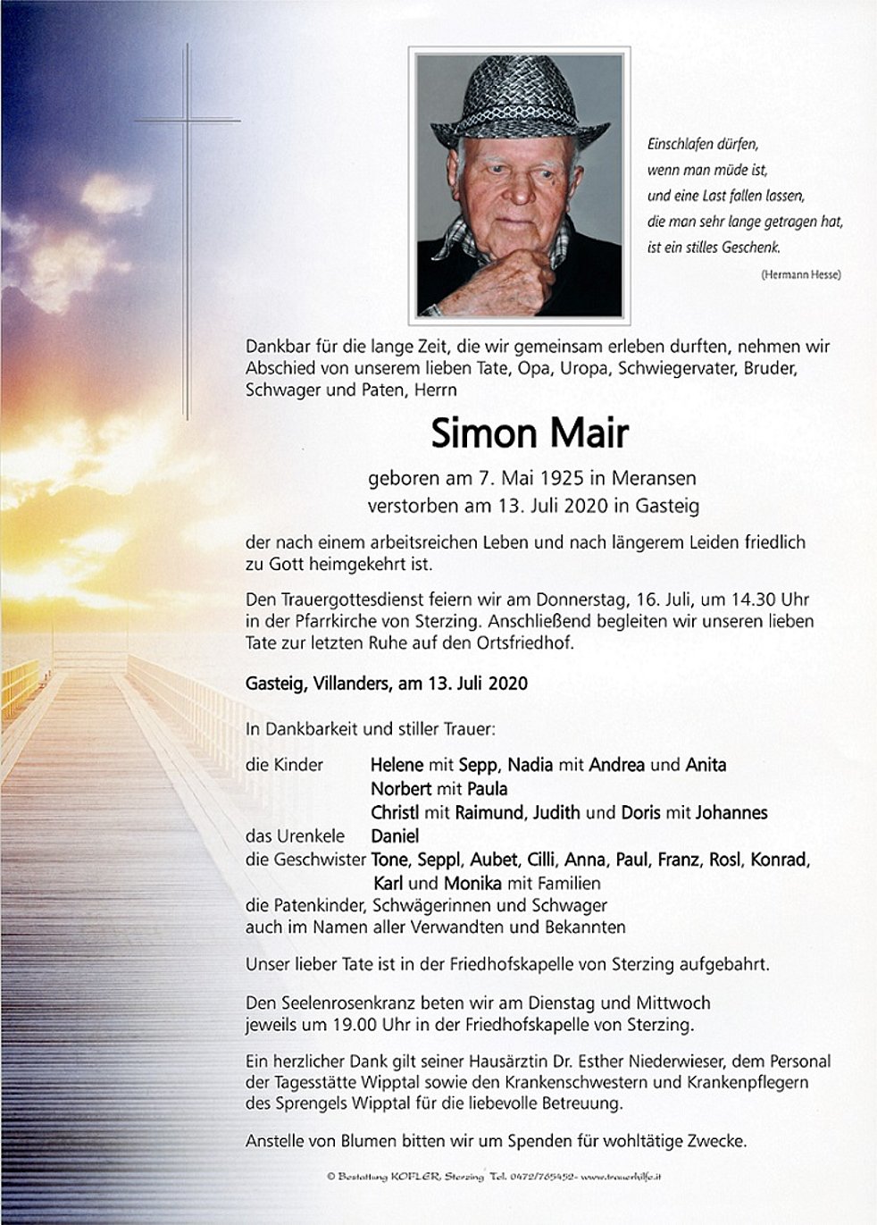 Den Trauergottesdienst feiern wir am Donnerstag, 16. Juli, um 14.30 Uhr in der Pfarrkirche von Sterzing. Anschließend begleiten wir unseren lieben Tate zur letzten Ruhe auf den Ortsfriedhof.