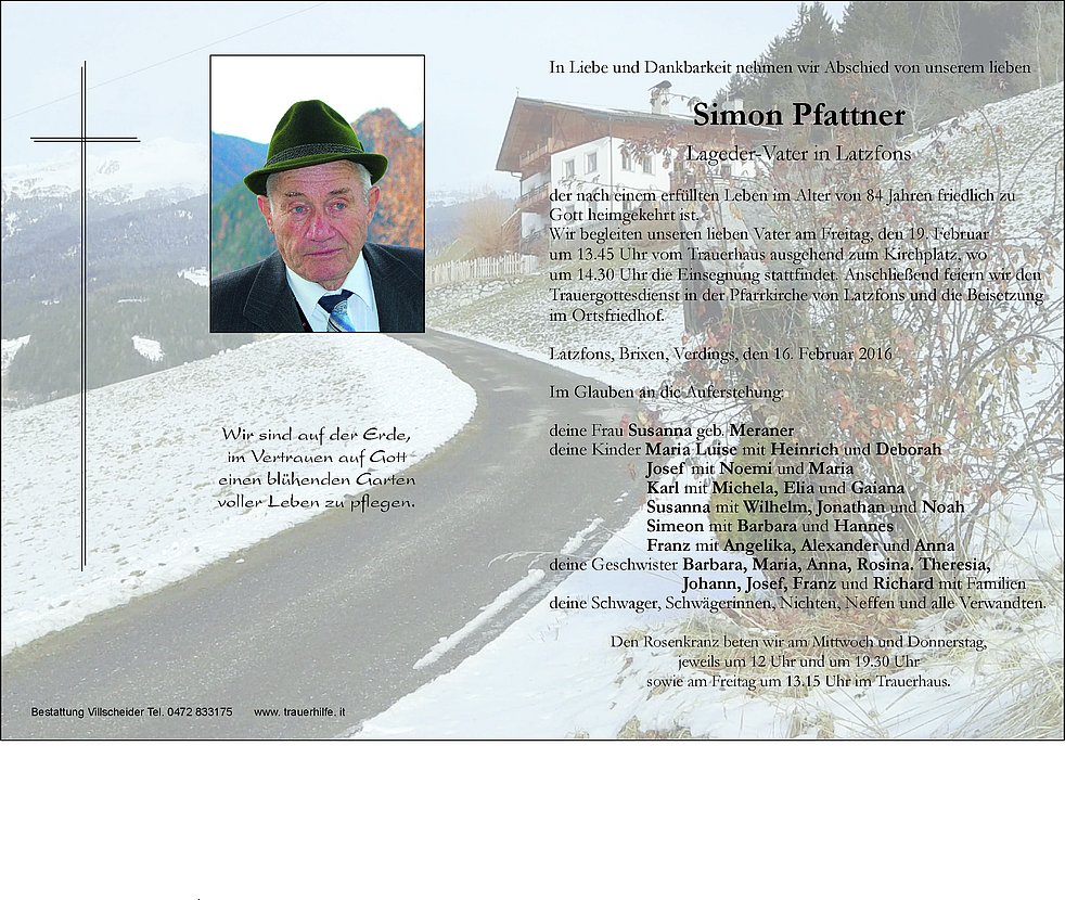 um 14.30 Uhr die Einsegnung stattfindet. Anschließend feiern wir den Trauergottesdienst in der Pfarrkirche von Latzfons und die Beisetzung