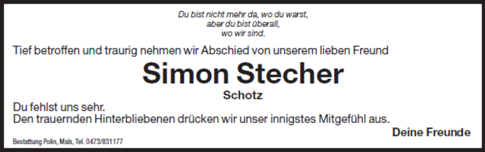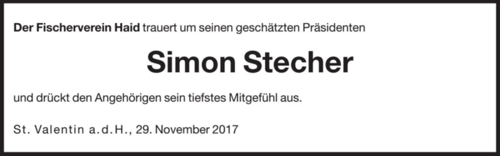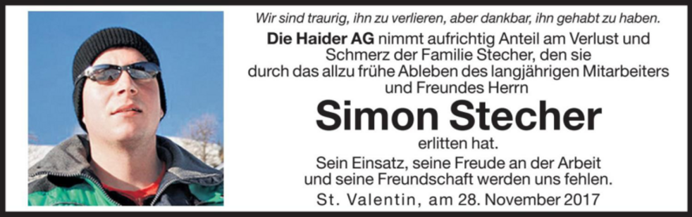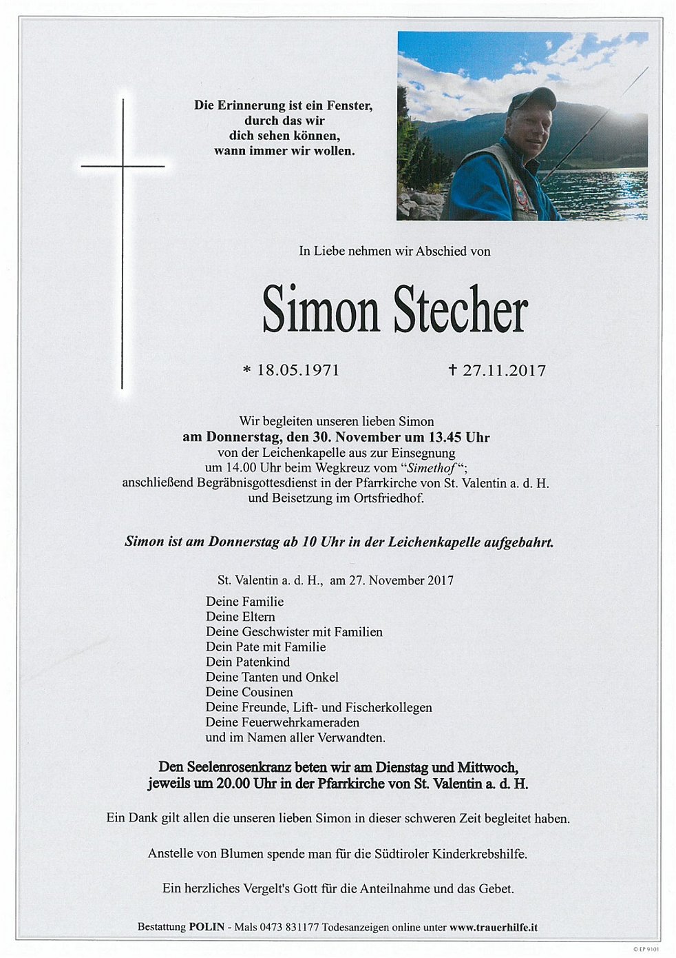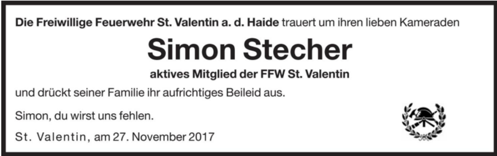 Wir begleiten unseren lieben Simon am Donnerstag, den 30. November um 13.45 Uhr von der Leichenkapelle aus zur Einsegnung um 14.00 Uhr beim Wegkreuz vom “Simethof “; anschließend Begräbnisgottesdienst in der Pfarrkirche von St. Valentin a. d. H. und Beisetzung im Ortsfriedhof.