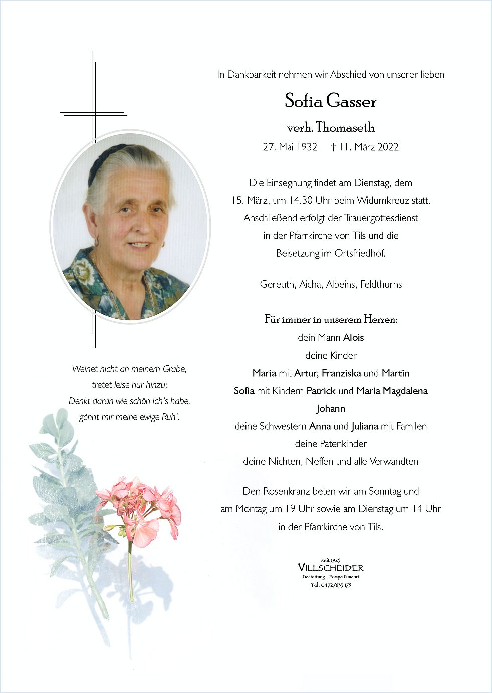 Begräbnisgottesdienst: 15.03. - 14:30 Uhr Tils
